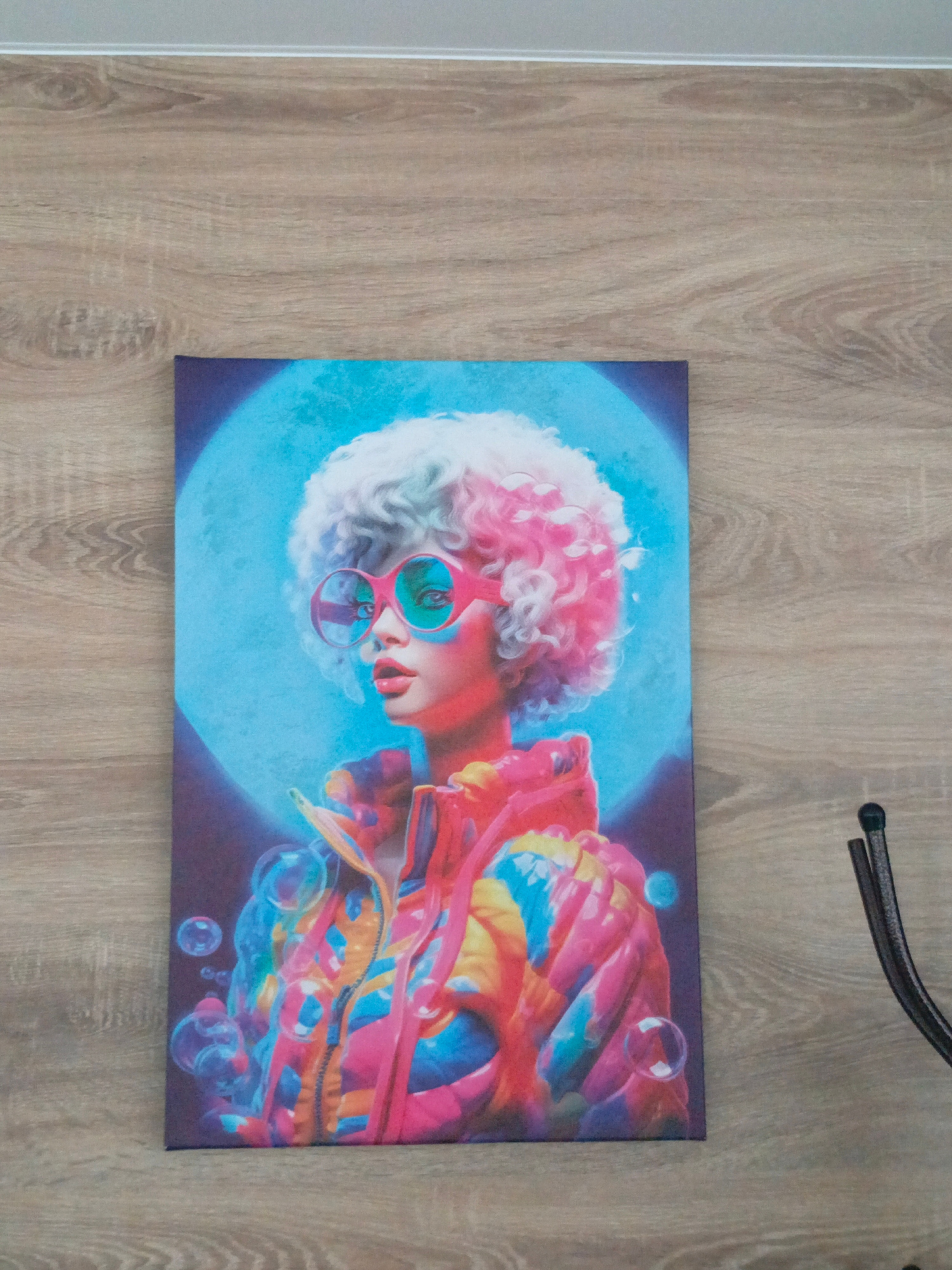 A colorful canvas print hangs on a light brown, wood-grained wall. The print features a stylized portrait of a woman with a white, curly afro tinged with pink, wearing large, pink-rimmed glasses with…read more