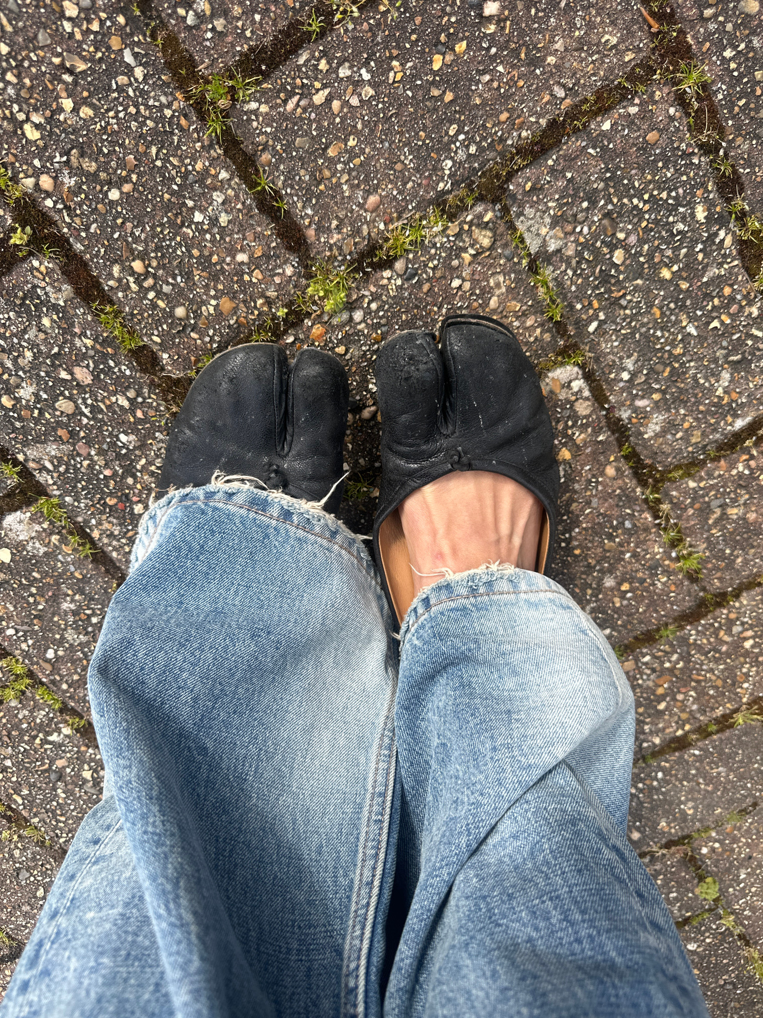 The image shows a person's legs from the knees down, wearing blue jeans and black split-toe shoes (Tabil shoes). The person is standing on a paved surface made of small stones and concrete with weeds…read more