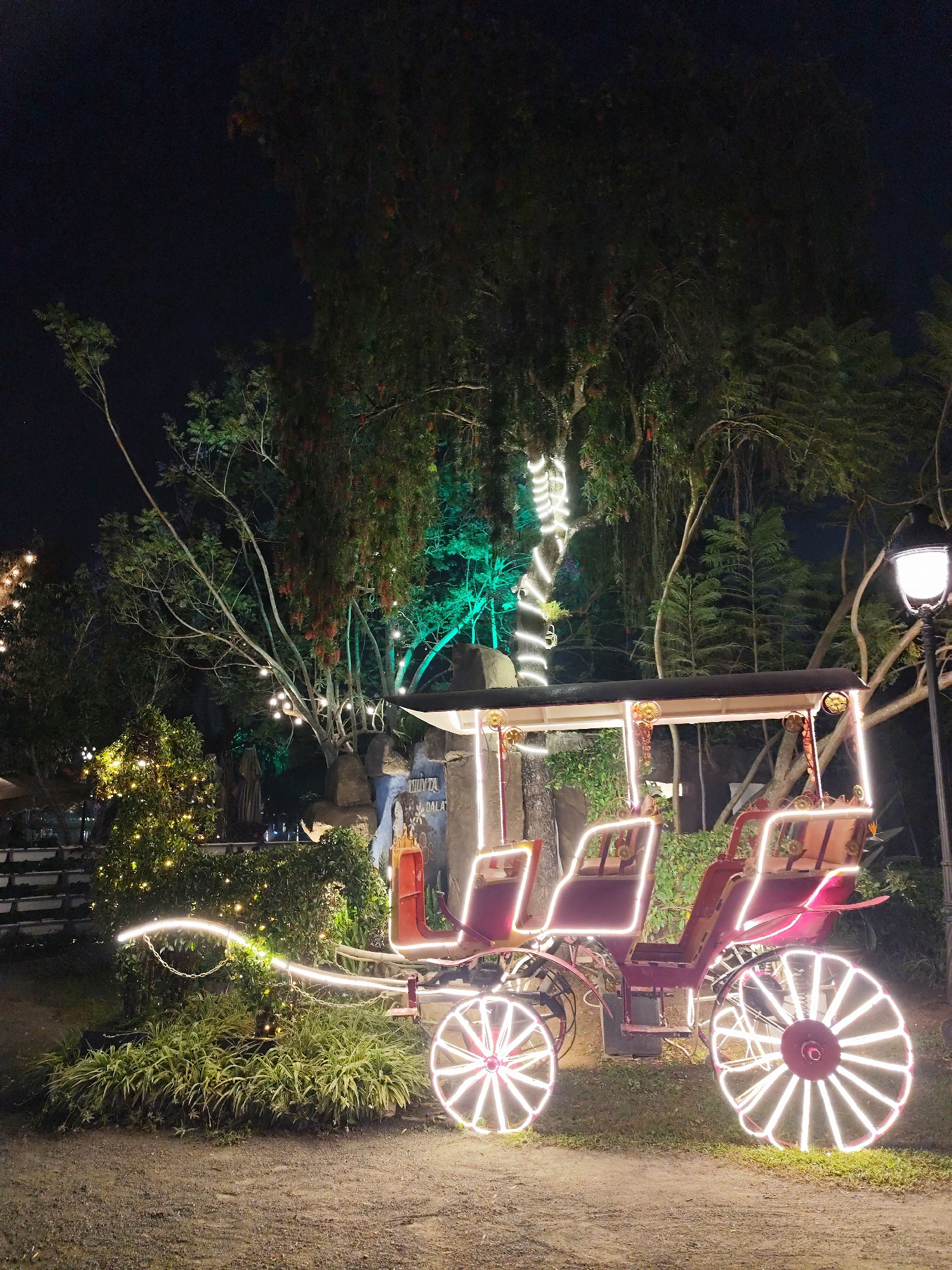 The image displays a nighttime scene in an outdoor garden or park setting in Da Lat, Vietnam. The prominent feature is a maroon-red, vintage-style carriage, extensively decorated with bright white LED…read more