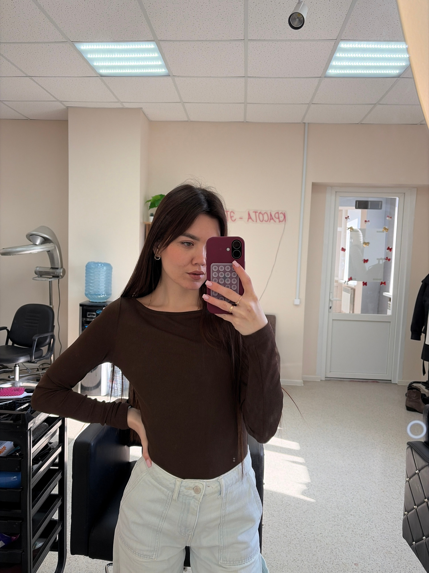 A medium shot shows a woman in a brown long-sleeved shirt and light wash denim pants holding a maroon smartphone in front of her face, possibly taking a selfie. The woman has dark hair and is wearing…read more