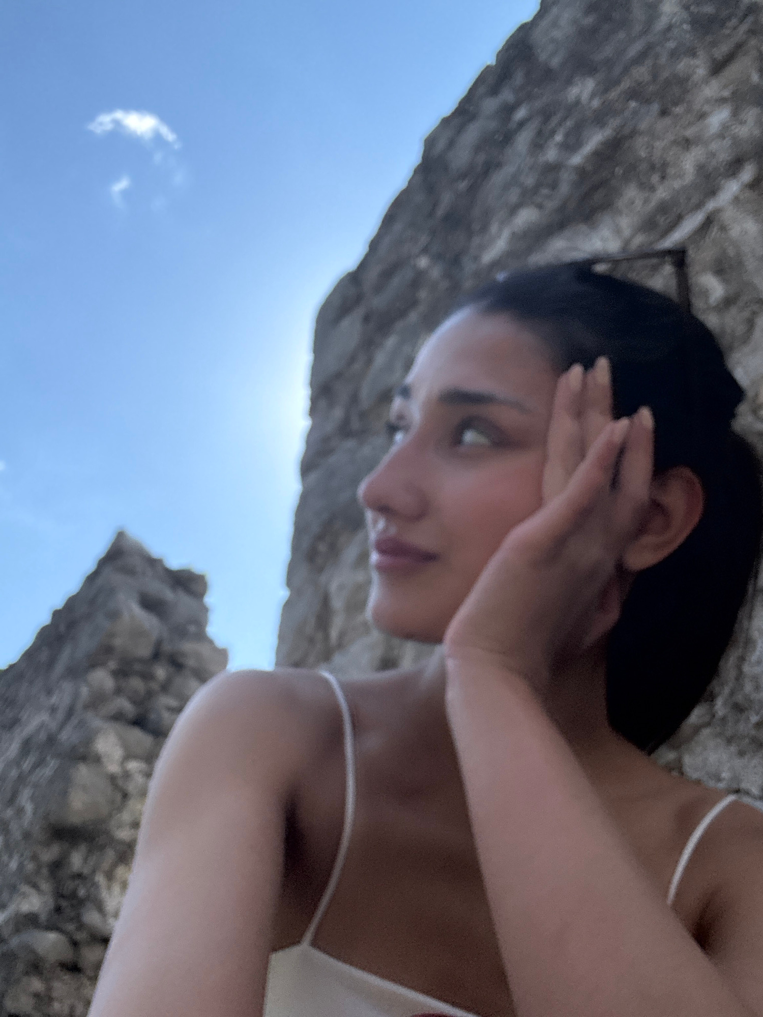 A woman with dark hair, light skin, and wearing a light-colored top with thin straps is positioned in a cave or rock formation in Sutomore, Montenegro. She is looking off to the side and holding her h…read more