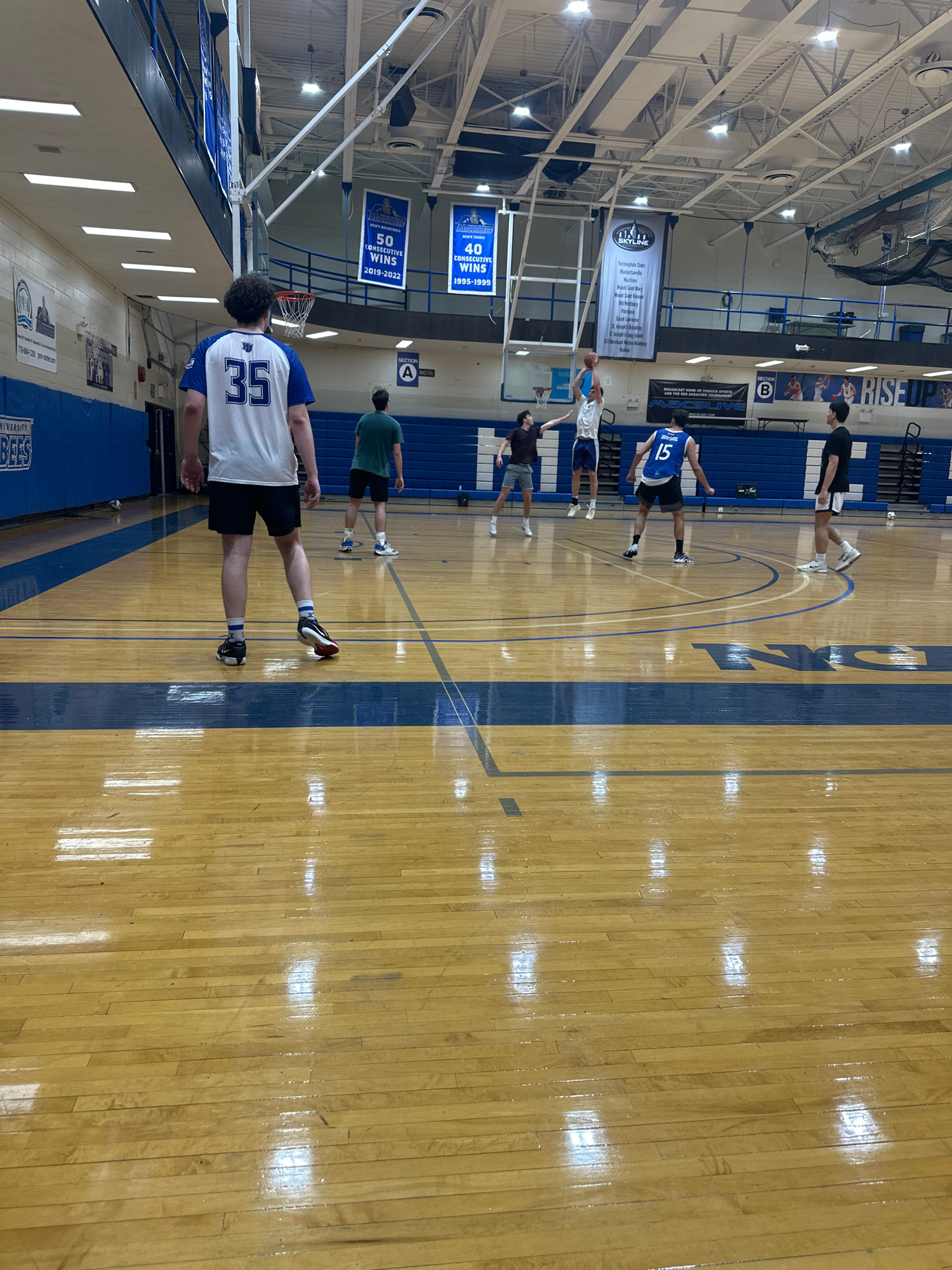 The image captures an indoor basketball court within a brightly lit gymnasium, likely at a college or university. The wooden floor features distinct blue and white lines, along with the blue painted l…read more