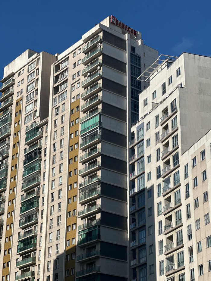 The scene depicts a cluster of three modern high-rise buildings in Esenyurt, Turkey, under a clear, bright blue sky. The central and most prominent building features a multi-story facade primarily composed of light beige panels, interspersed with vertical sections of light brown and horizontal dark grey bands separating floors. This building is characterized by numerous balconies, many with clear glass railings, and some enclosed with green-tinted glass. The word "BABACAN" is displayed in red capital letters on the rooftop of this central structure. To the immediate left, a similar high-rise building with a light-colored facade and balconies is partially visible. To the right, another high-rise building, predominantly light grey, exhibits a distinct architectural style with varying window and balcony configurations and a unique open metal framework on its rooftop. Strong sunlight casts distinct shadows on parts of the buildings. No individuals, animals, or active events are present in the visible environment. | Open Wire