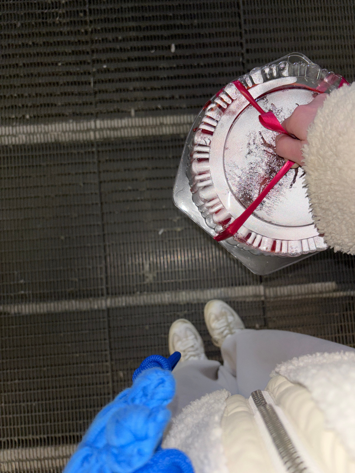A top-down shot shows a person holding a cake in a clear plastic container with a red ribbon while standing on a moving walkway. The walkway has a dark, textured surface with parallel lines. Another p…read more