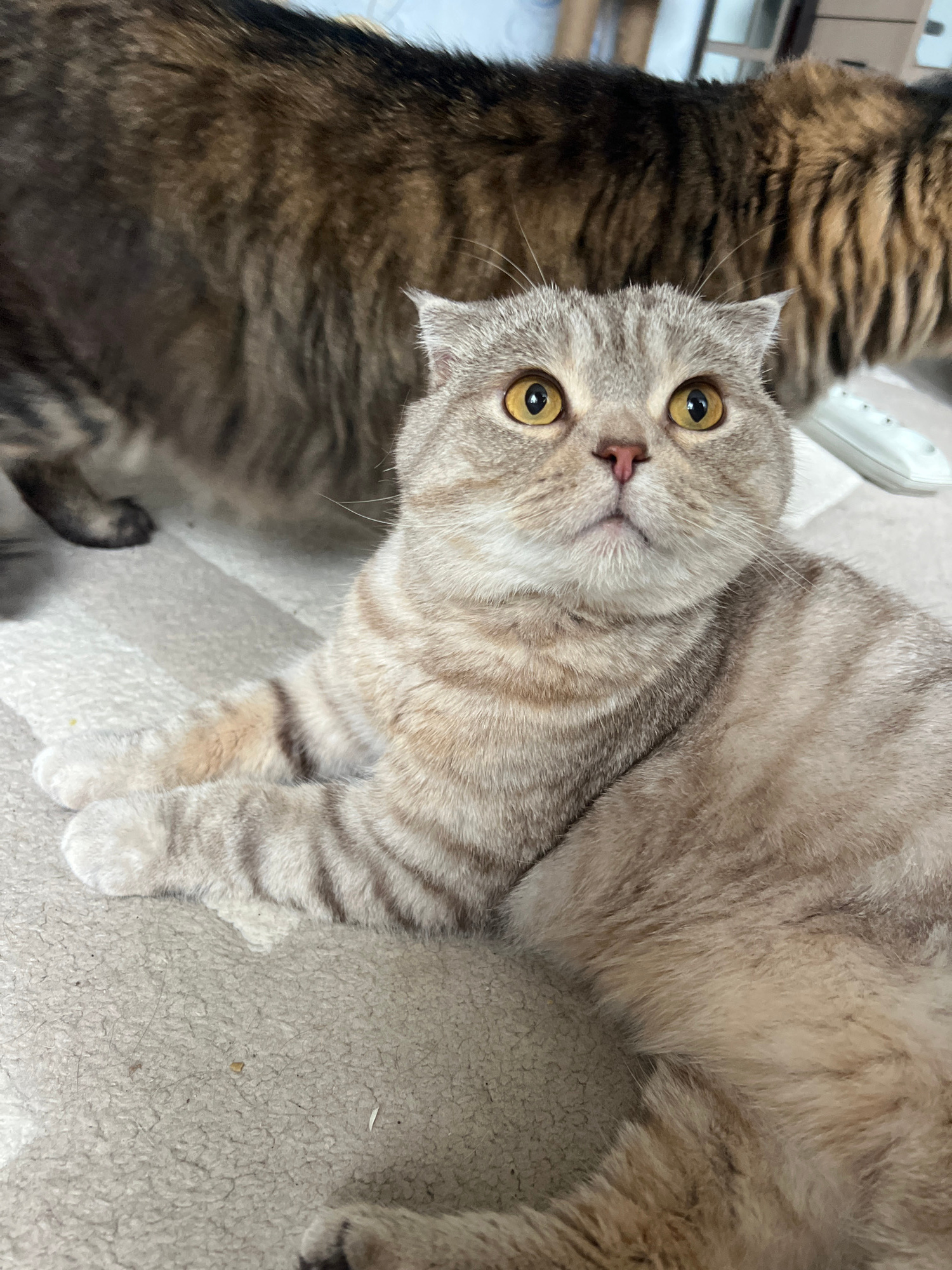 The image features two cats in an indoor setting in Chaikovsky, Russia. The main subject is a light-colored tabby cat, likely a Scottish Fold due to its distinctive folded ears, lying on a soft, light…read more