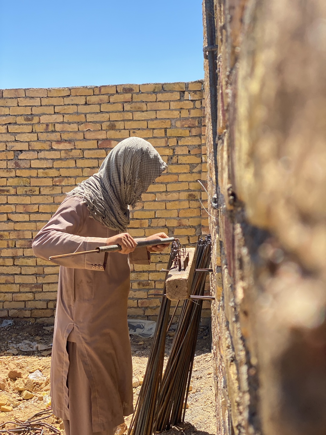 A person, face covered by a headscarf, is building a brick wall using metal rebar in Kandahar, Afghanistan. The person is dressed in a long, brown, traditional garment. They are using a tool to secure…read more