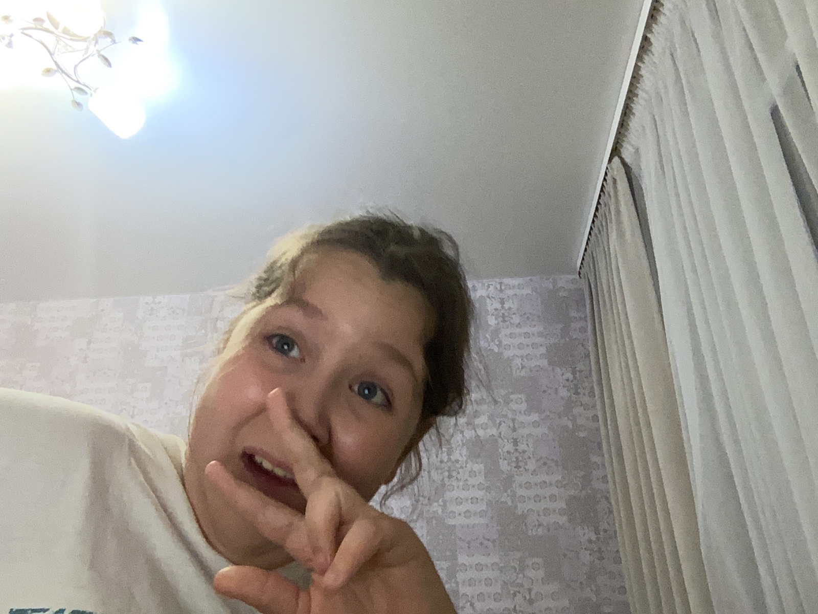 A person is seen from an upside-down perspective, making a gesture with their hand near their face. They have blue eyes and their hair is pulled back. They are wearing a light-colored shirt. In the ba…read more