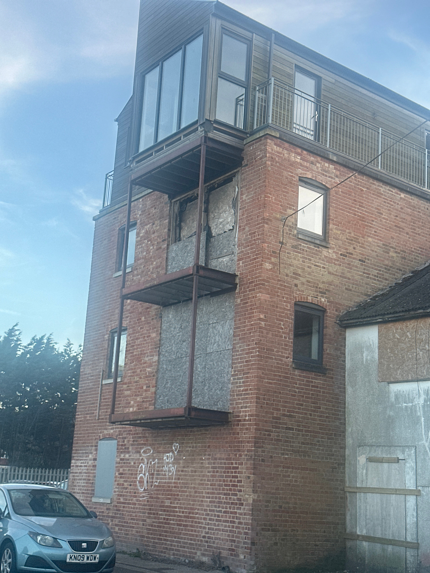 The image depicts a three-story brick building in East Suffolk, United Kingdom. The building has a mix of brick and wood paneling. The windows on the middle level appear to be boarded up. Steel supporβ¦read more