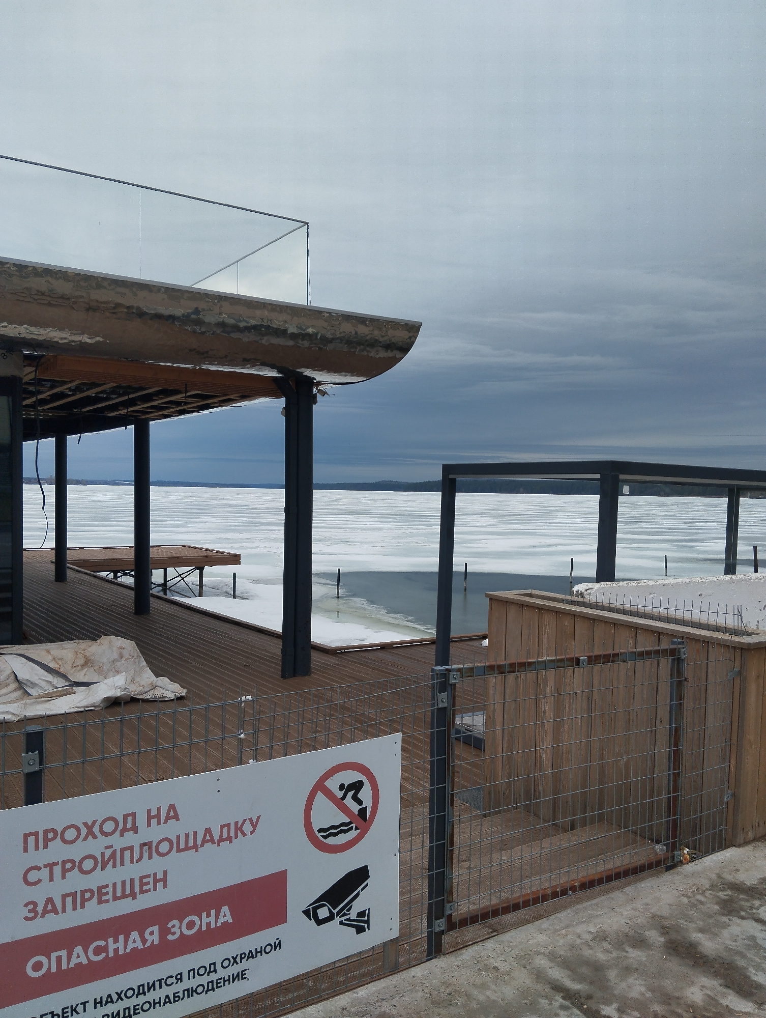 The image depicts a waterfront construction site in Votkinsk, Russia, situated along the Votkinsk Reservoir. The ground is covered with snow and ice, extending to the horizon. On the left is a wooden…read more