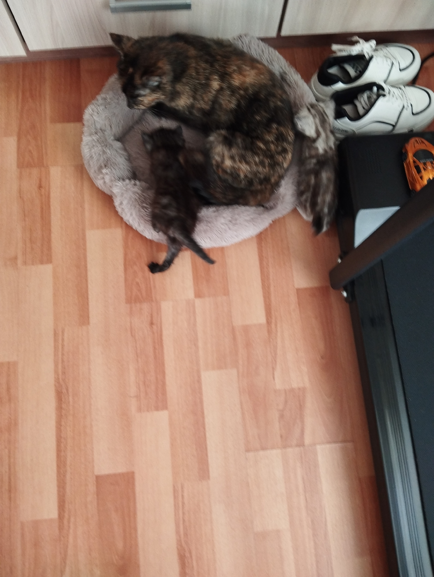 The image shows a tortoiseshell cat and its kittens in a light gray cat bed. The bed is placed on a light-colored, wood-patterned floor near a light-colored cabinet and a pair of white sneakers. Part…read more