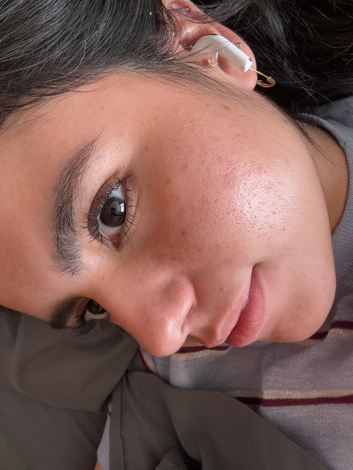 Close-up of a person's face, positioned at an angle. The individual has dark hair, brown eyes, and appears to have a white wireless earbud in their left ear. The earbud is decorated with a safety pin…read more