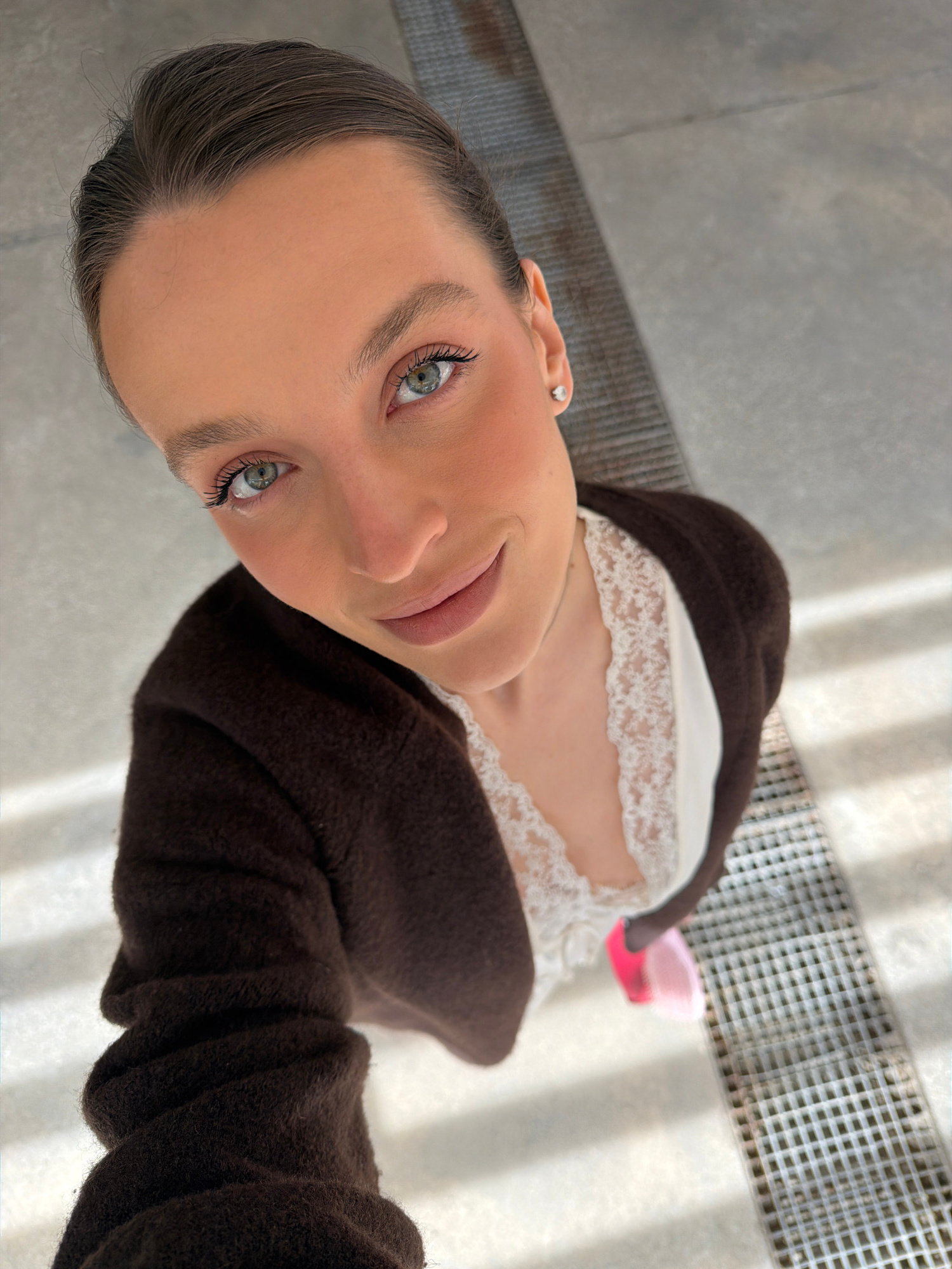 A woman with fair skin, light green eyes, and dark hair is facing the camera in a selfie. She is wearing a brown, textured cardigan over a white top with lace detailing around the neckline. She has a…read more