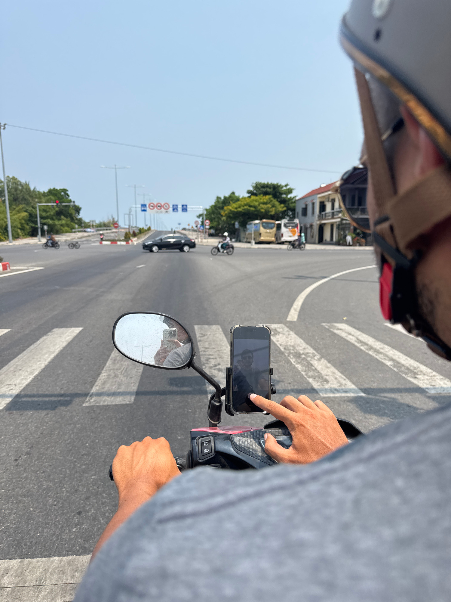 The image presents a first-person perspective from a motorbike rider on an urban road during bright daylight, likely in Đà Nẵng, Vietnam. The rider's helmet is visible at the top, and part of a gray s…read more