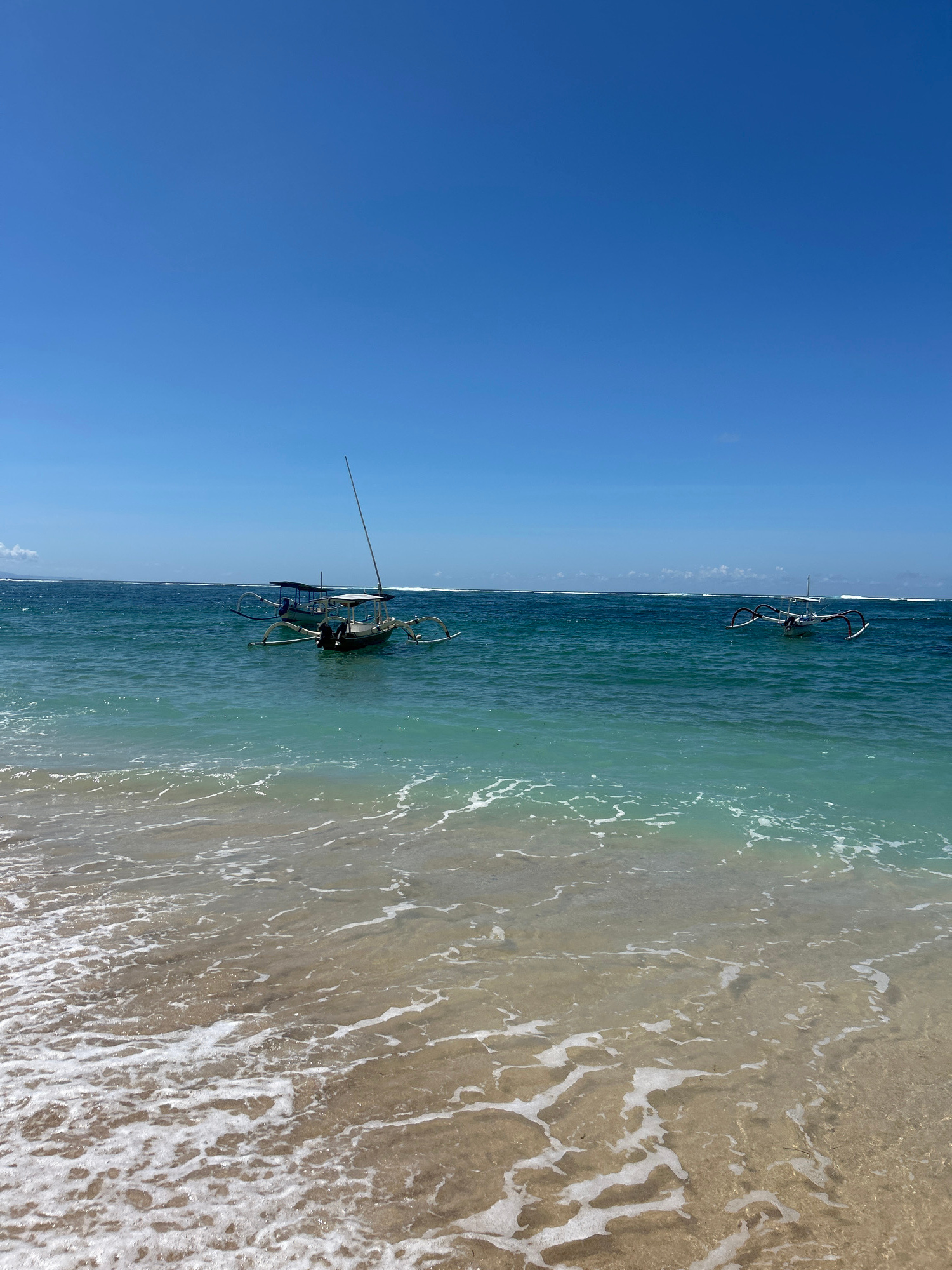 The image depicts a beach scene in Kuta Selatan, Indonesia. Two traditional Indonesian fishing boats, known as Jukung, are visible in the water. The boats have outriggers and a slender mast. The water…read more