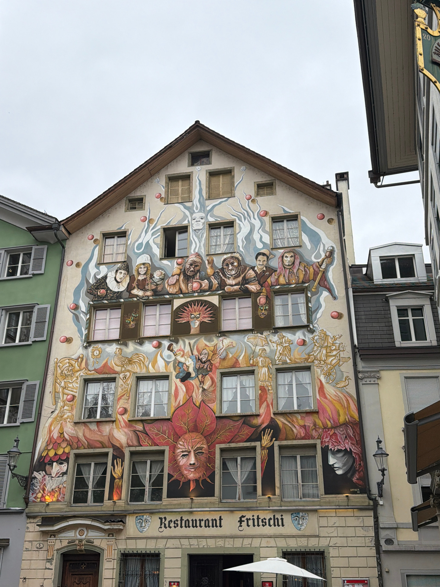 The image shows a building with an elaborate mural in Lucerne, Switzerland. The mural depicts various figures and scenes, including carnival masks and allegorical representations. The building has sev…read more