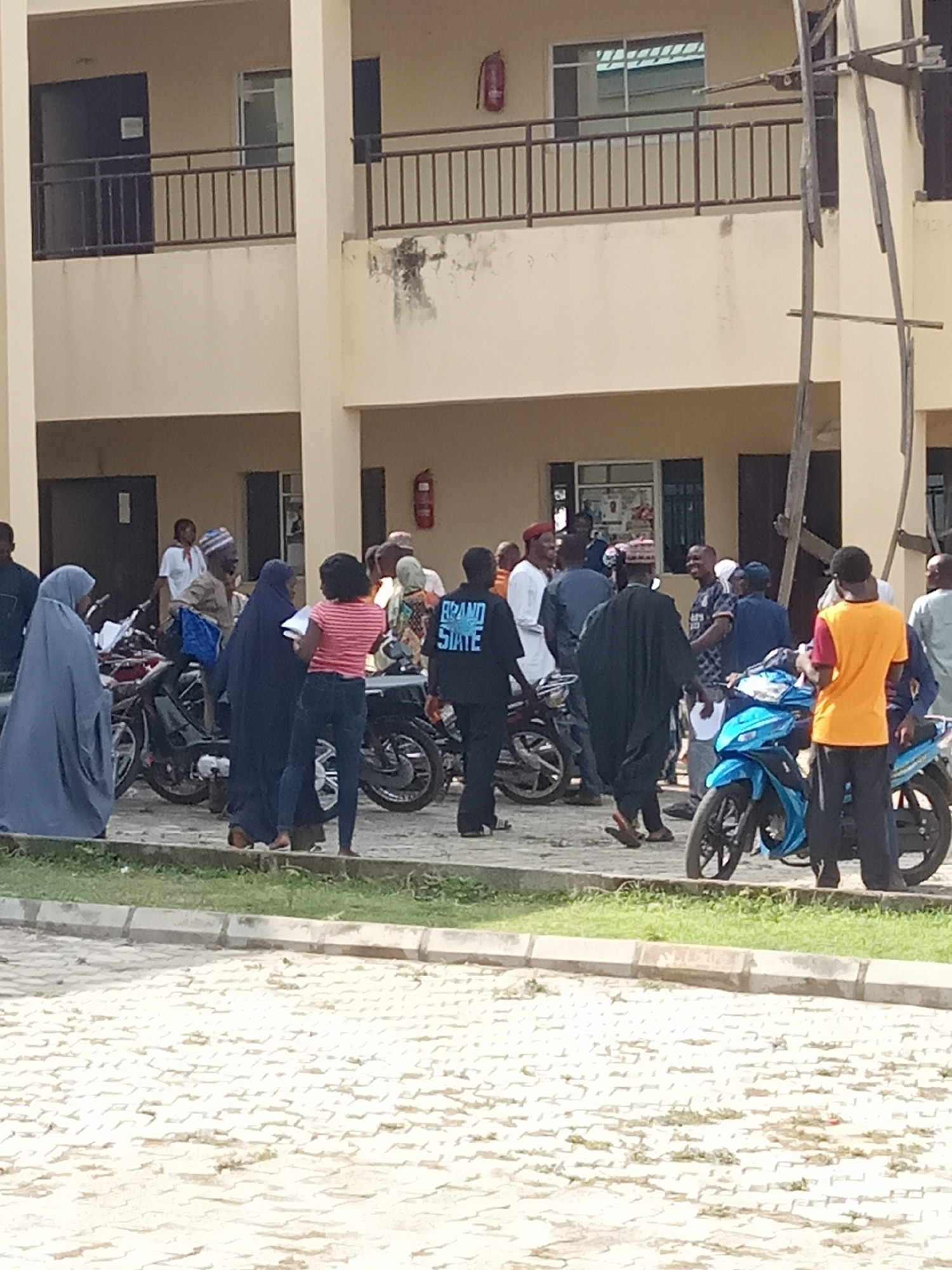 The image shows a group of people gathered in front of a two-story, beige building in Akwanga, Nigeria. Several motorcycles are parked among the crowd. Individuals are dressed in a mix of traditional…read more
