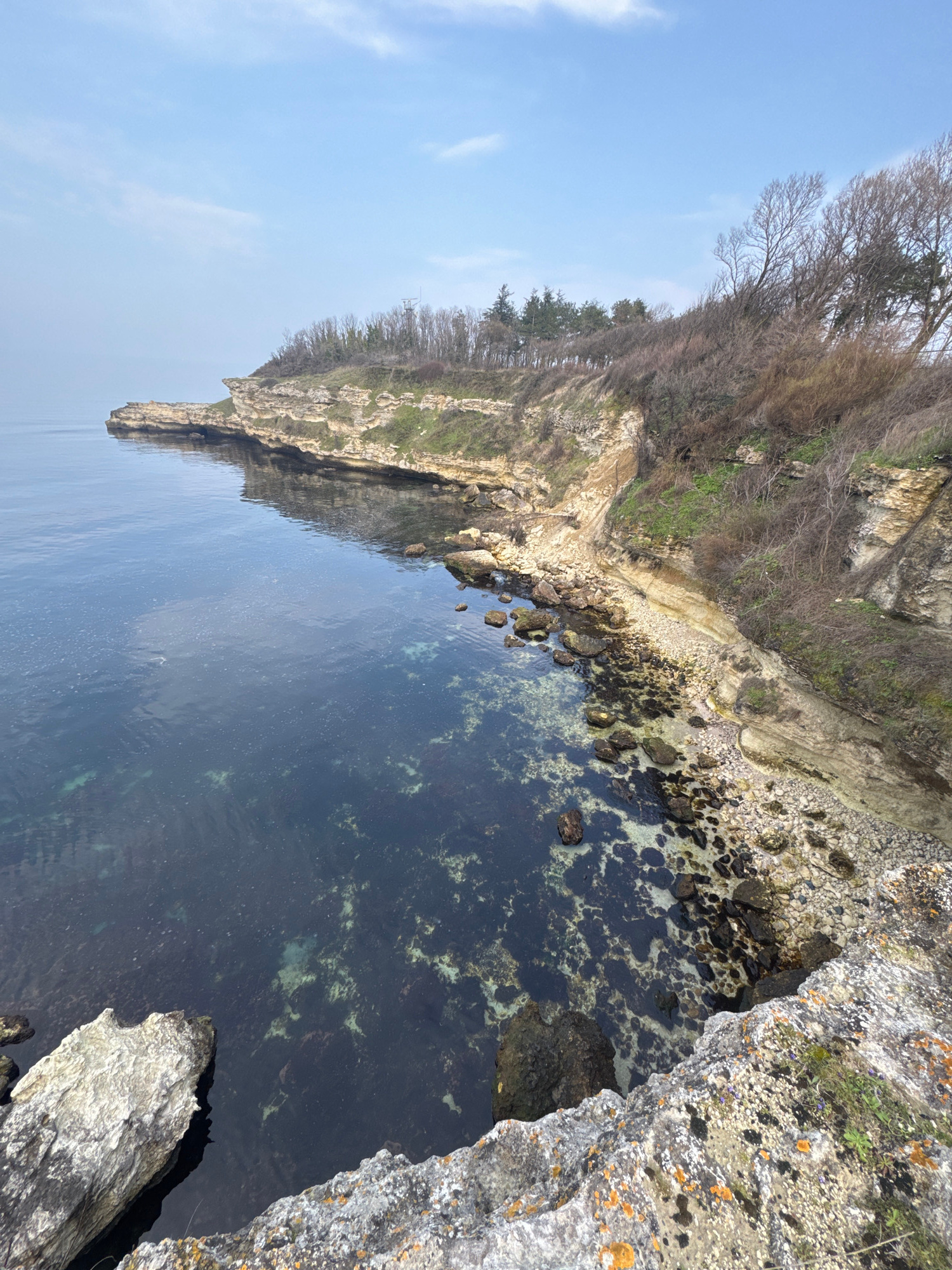 The image shows a rocky coastline near the city of Tsarevo, Bulgaria. A cliff face covered in sparse vegetation and bare trees overlooks the clear, dark water. Rocks are visible along the shoreline anβ¦read more