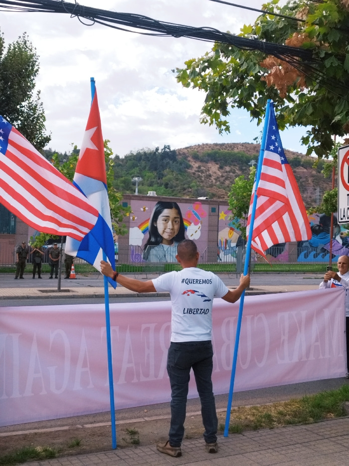 A man stands with arms outstretched, holding the US and Cuban flags. He wears a white t-shirt with "#QUEREMOS LIBERTAD" printed on the back above a Cuban flag outline. A large banner is spread out in…read more