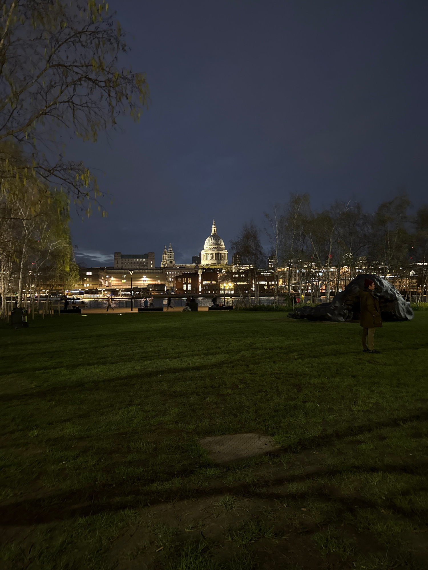 The image depicts an outdoor night scene in the city of London, United Kingdom, specifically from an open green space, likely on the South Bank of the River Thames, looking north towards the City of L…read more