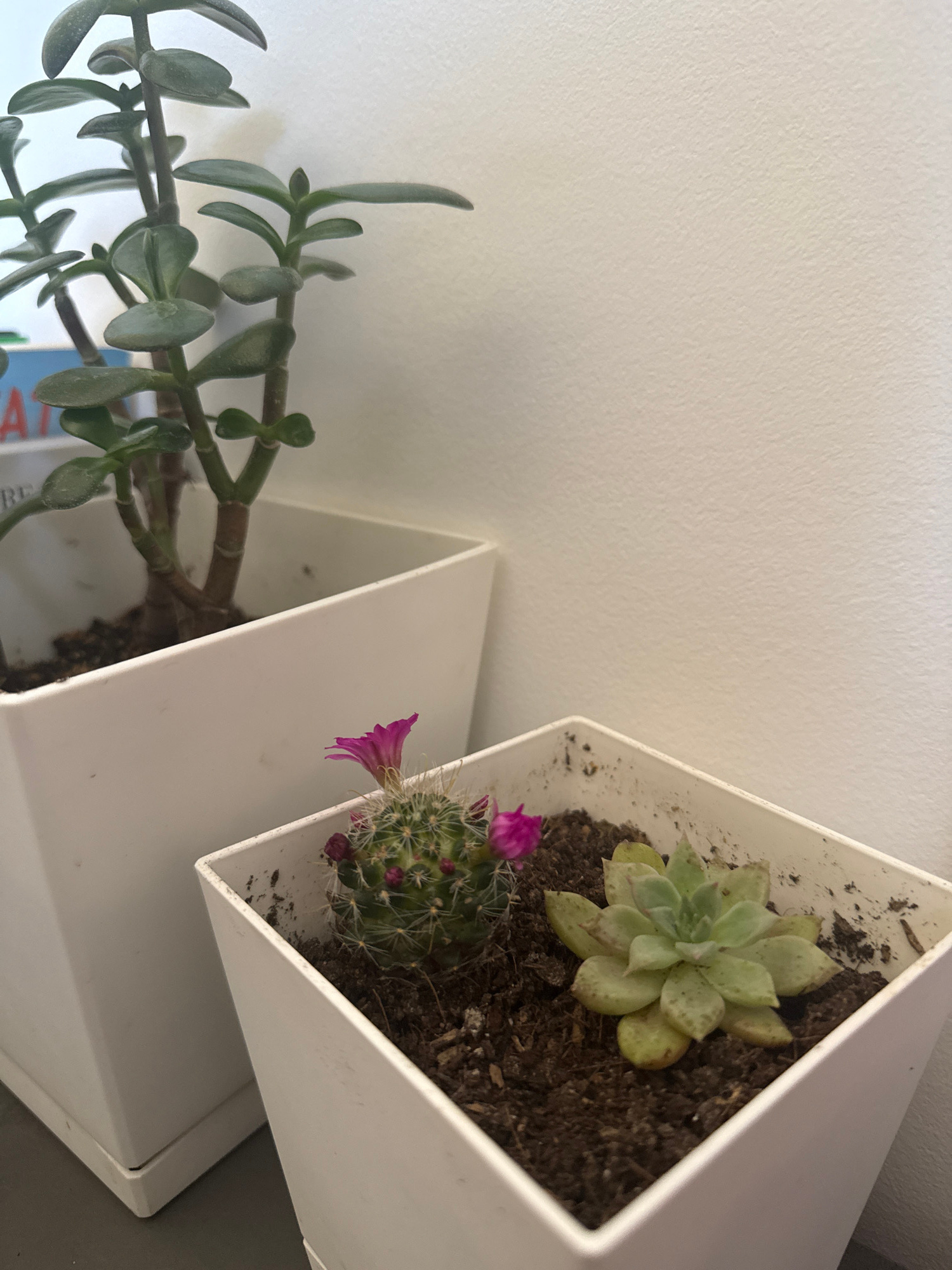 The image shows three potted plants in white, geometrically-shaped planters. The plants are arranged vertically. From top to bottom, the first planter contains a succulent, the second planter contains…read more