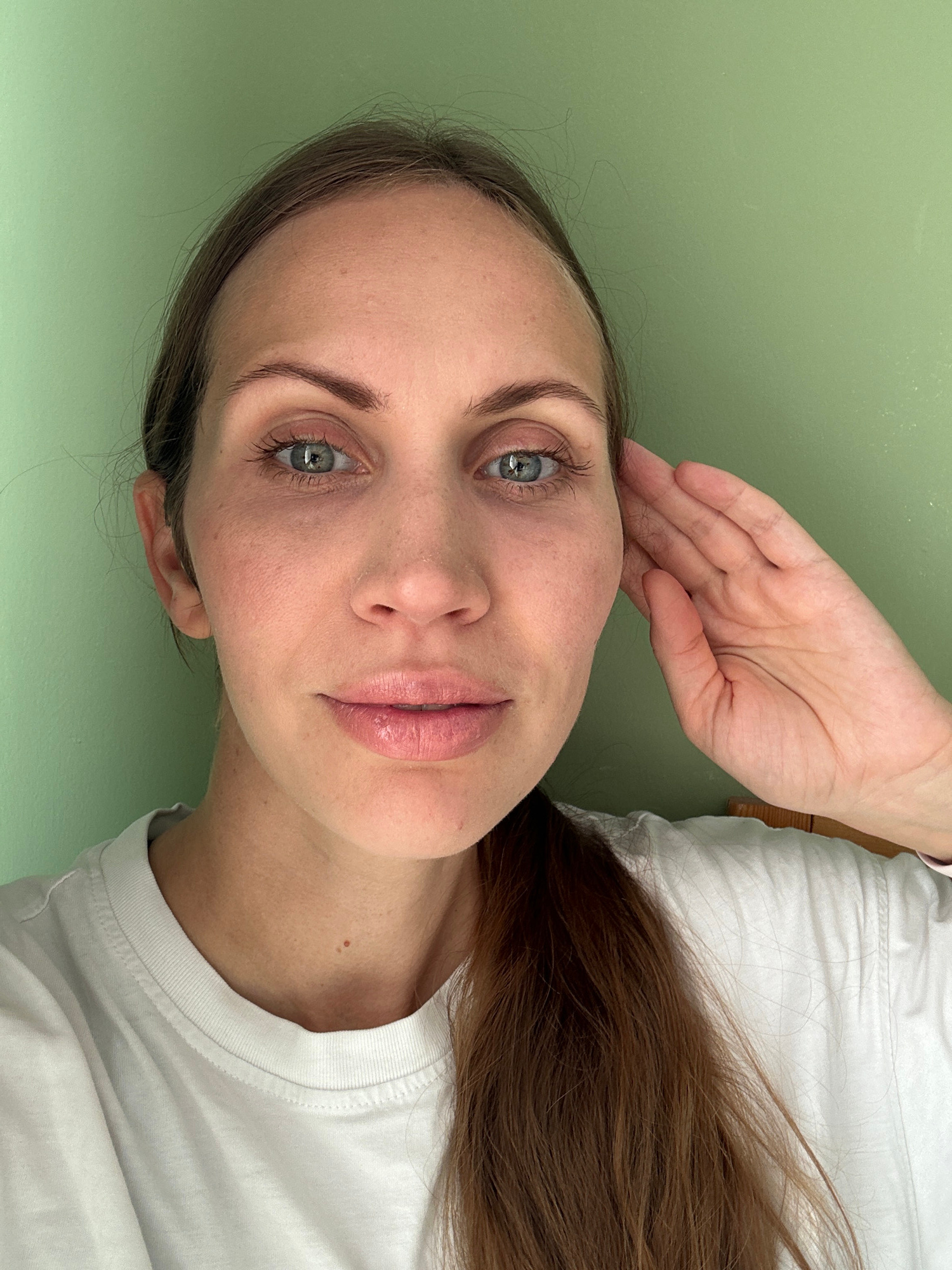 A woman with light skin, brown hair, and light-colored eyes is facing the camera. She is wearing a white shirt. Her right hand is near her head. The background is a light green color. It is not possib…read more