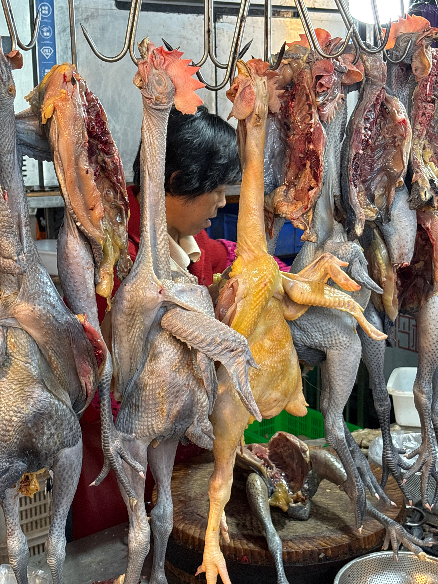 The image shows a street food scene in Jiangjin, China. There are several chickens hanging on metal hooks, some of which appear to be eviscerated. The chickens vary in color, with some being black-skinned and others yellow. A person with short, dark hair is partially visible behind the chickens. The background contains elements of a market setting, including a wooden cutting board and various containers. The scene appears to be a vendor selling poultry. | Open Wire