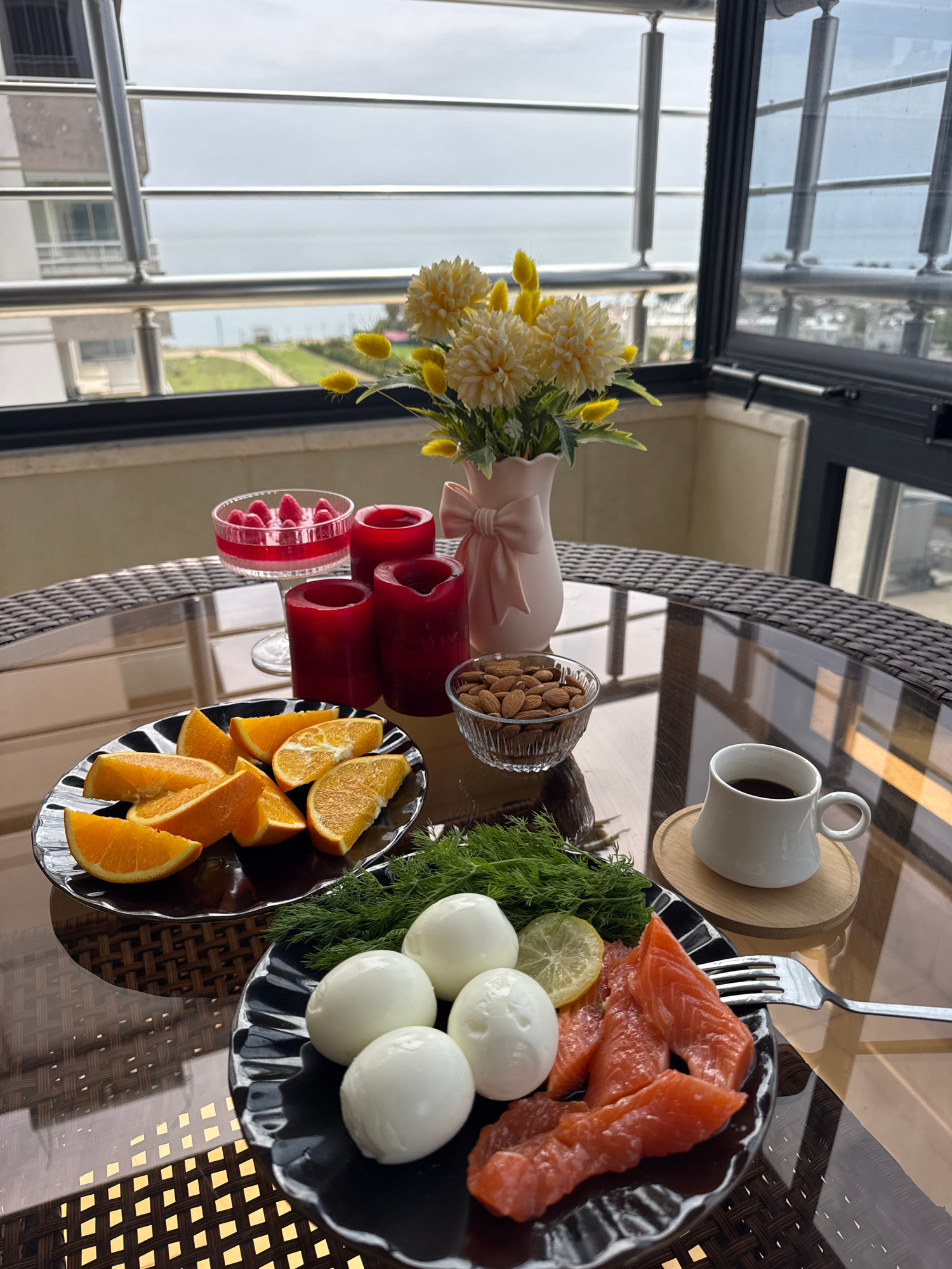 The image shows a table set for breakfast or brunch, possibly on a balcony or enclosed patio, judging by the large windows. On the table, there's a black decorative plate with salmon slices, boiled eg…read more