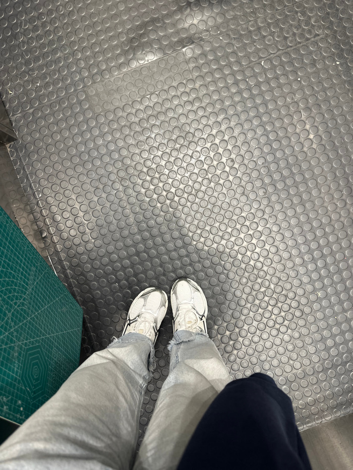 A high-angle shot depicts a person standing on a black rubberized floor with a repeating circular pattern. The individual wears white sneakers and light wash jeans with distressed hems. A portion of a…read more