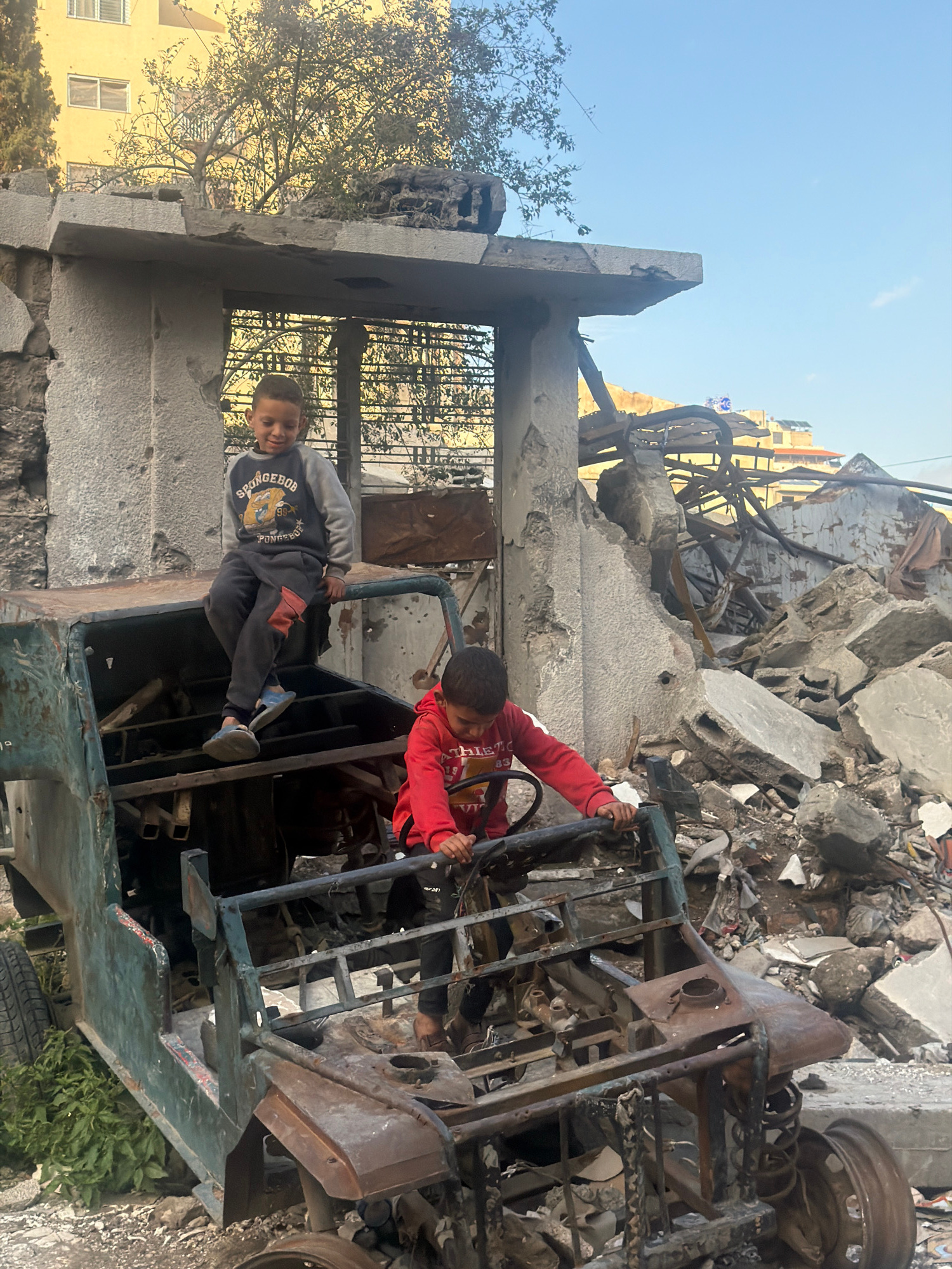 Two young boys are interacting with a heavily damaged or destroyed vehicle amidst a scene of extensive urban destruction. The older boy is in the driver's seat, holding the steering wheel. He is weari…read more