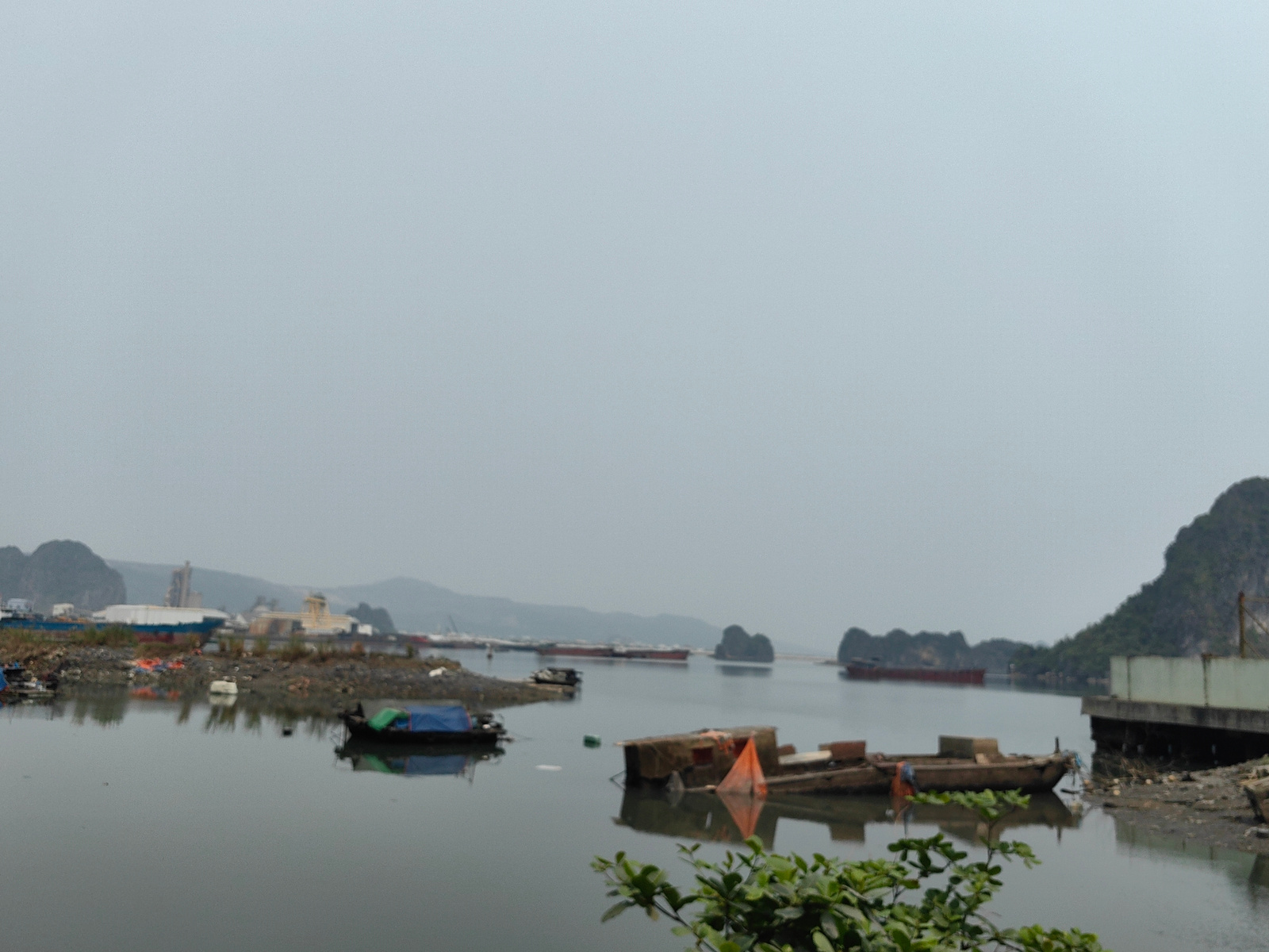 The image depicts a waterway scene in Quang Hanh Ward, Vietnam. Several small boats are docked along the shoreline. In the background, there are industrial structures and distant land formations. The…read more