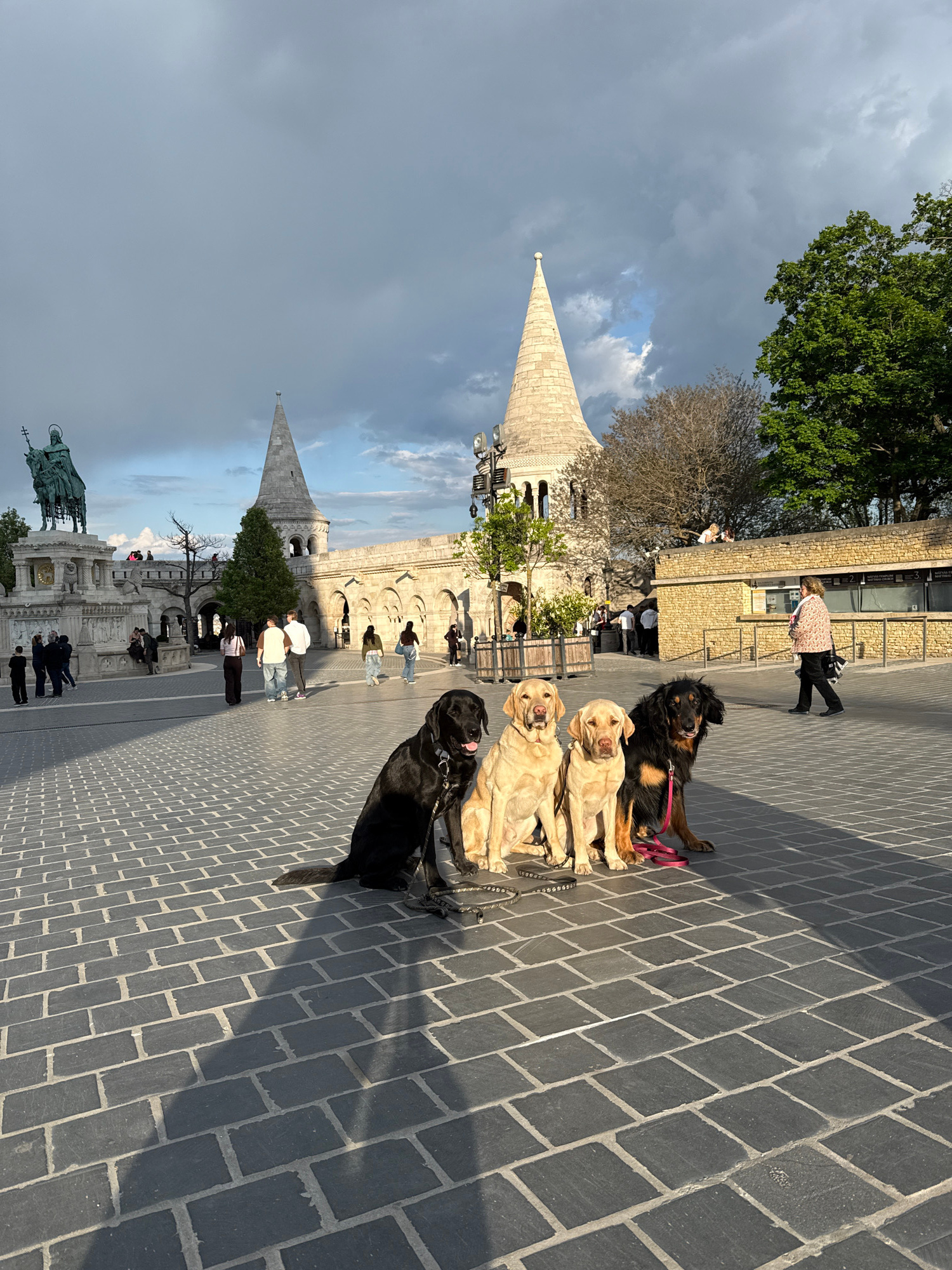 The image shows a row of five dogs sitting on a paved area. The dogs are of varying breeds and colors, including a black Labrador, two yellow Labradors, and a black and brown dog. They are lined up an…read more