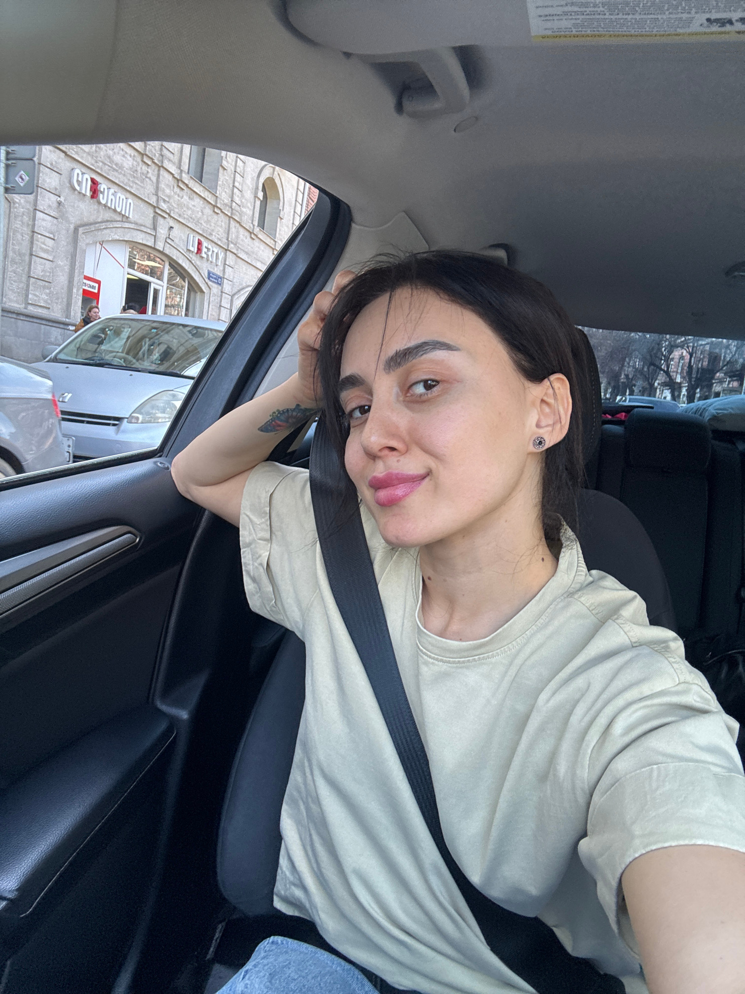 A woman wearing a beige t-shirt and a seatbelt is in a car, possibly in Tbilisi, Georgia. The photo appears to be a selfie, and the woman is leaning her head to the side. Outside the car window, there…read more