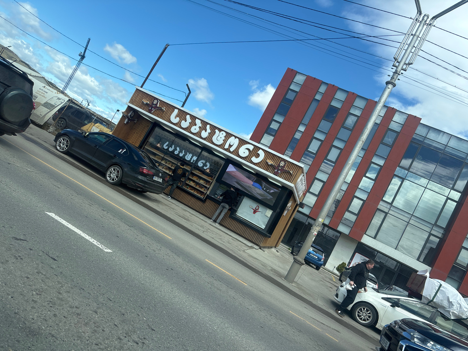 The image shows a street scene in Tbilisi, Georgia, under a bright blue sky with scattered clouds. A multi-story building with red and glass paneled windows stands on the left. A small roadside shop,…read more