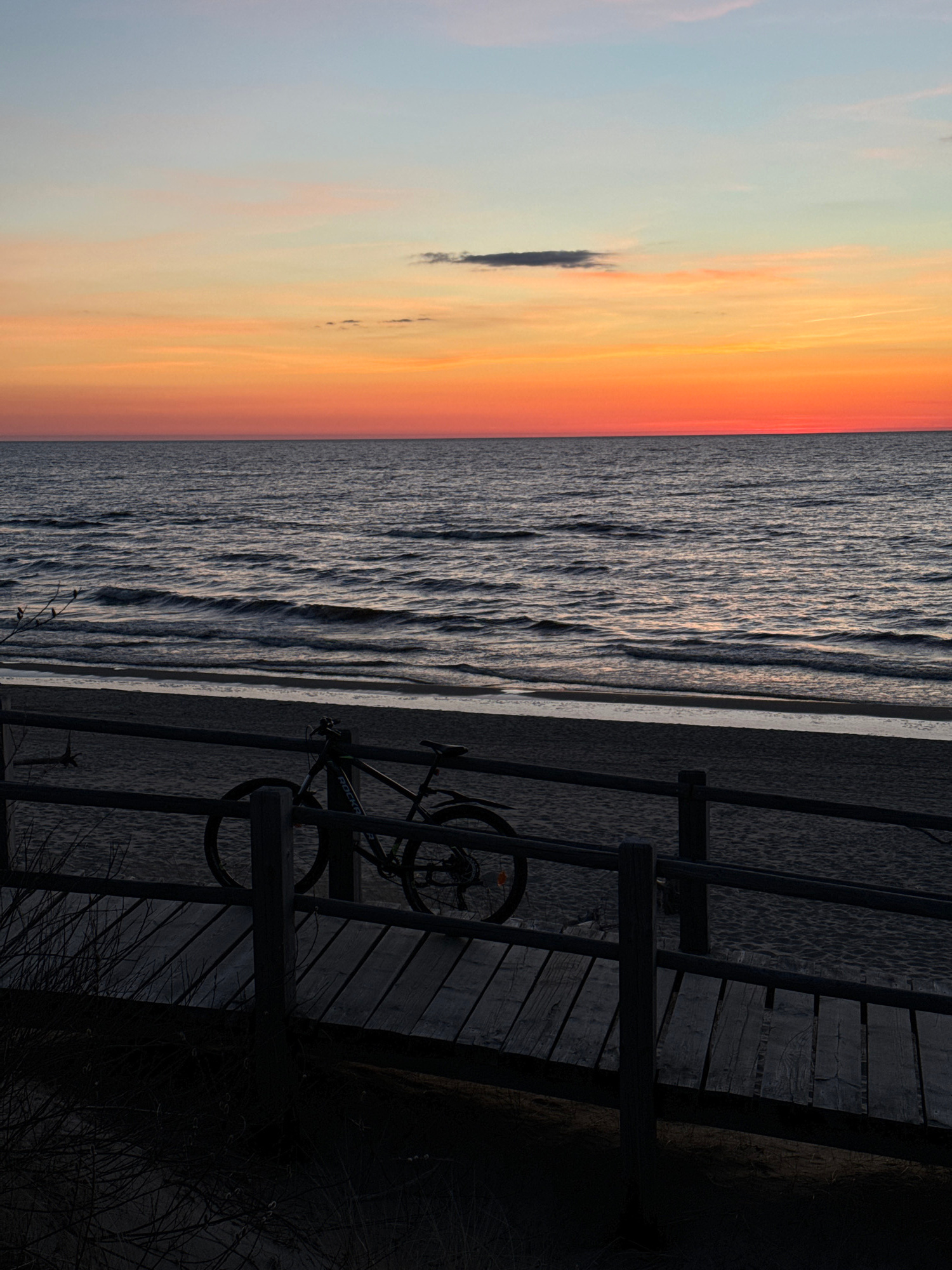 The image shows a landscape with a view of the sea at sunset, likely taken in Carnikava, Latvia. The sky exhibits a gradient of colors from orange near the horizon to lighter hues of blue and gray hig…read more