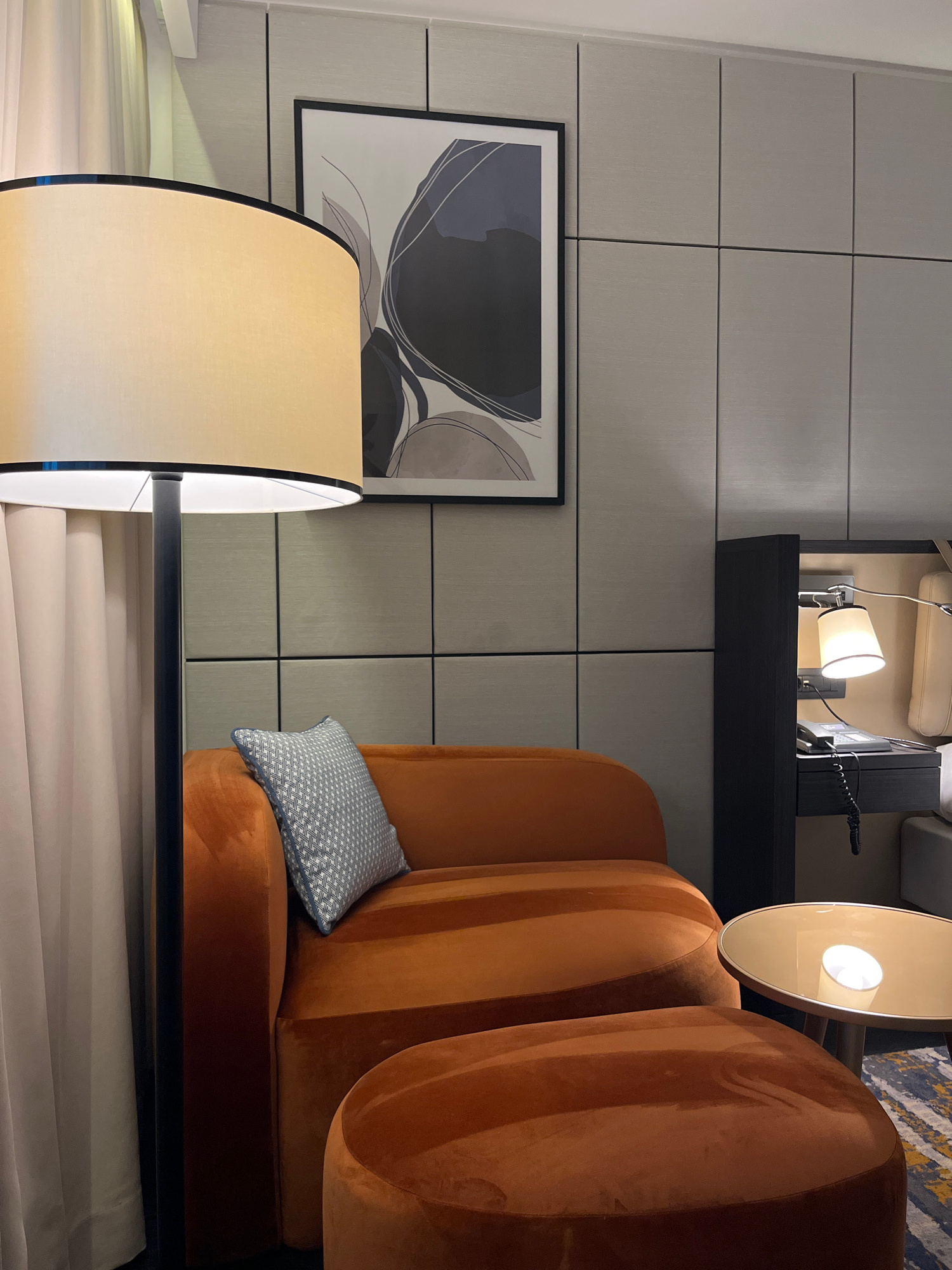 A room interior in Belgrade, Serbia is depicted. A burnt-orange velvet chair is prominently displayed with a patterned blue pillow resting on its seat. Behind the chair is a wall covered in grey, rect…read more