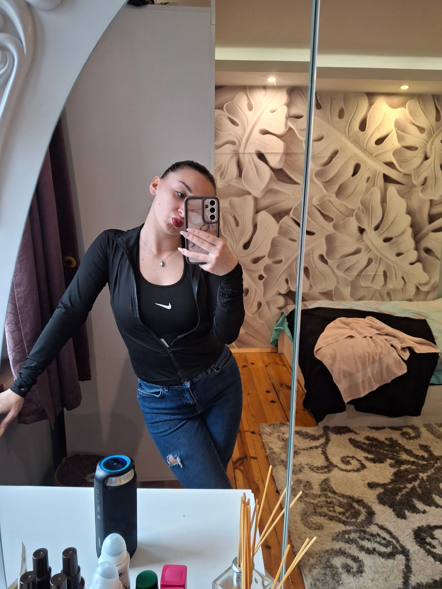 A young woman is taking a selfie in front of a mirror in what appears to be a bedroom. She is wearing a black Nike tank top, a black zip-up jacket, and blue jeans. The background features a wall with…read more