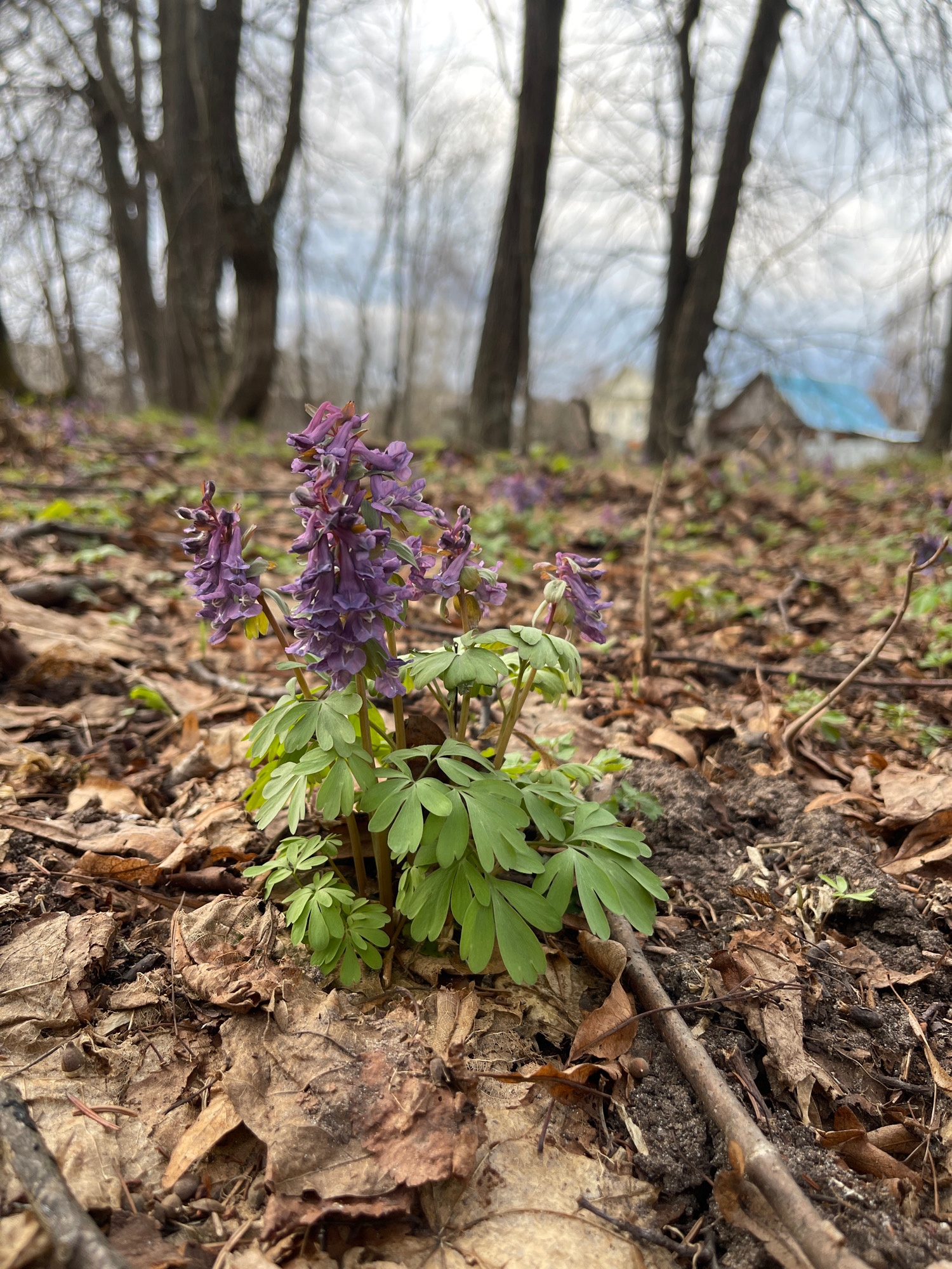 The image presents a natural scene, rotated 90 degrees clockwise from its likely original orientation, focusing on a patch of flowering plants on the forest floor. In the foreground and mid-ground, a…read more
