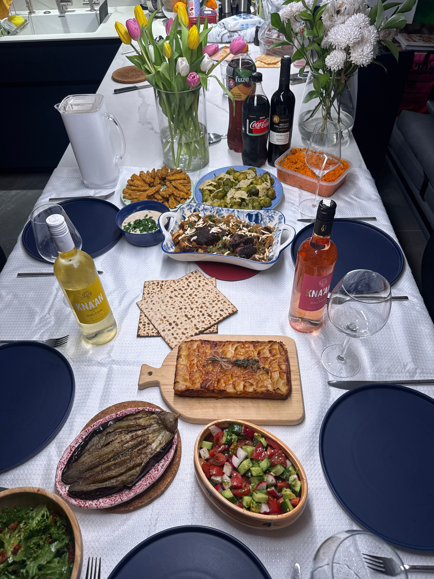 A table laden with various food items and beverages is set against a neutral backdrop. The table is covered with a white tablecloth and features an assortment of dishes, including salads, roasted vege…read more