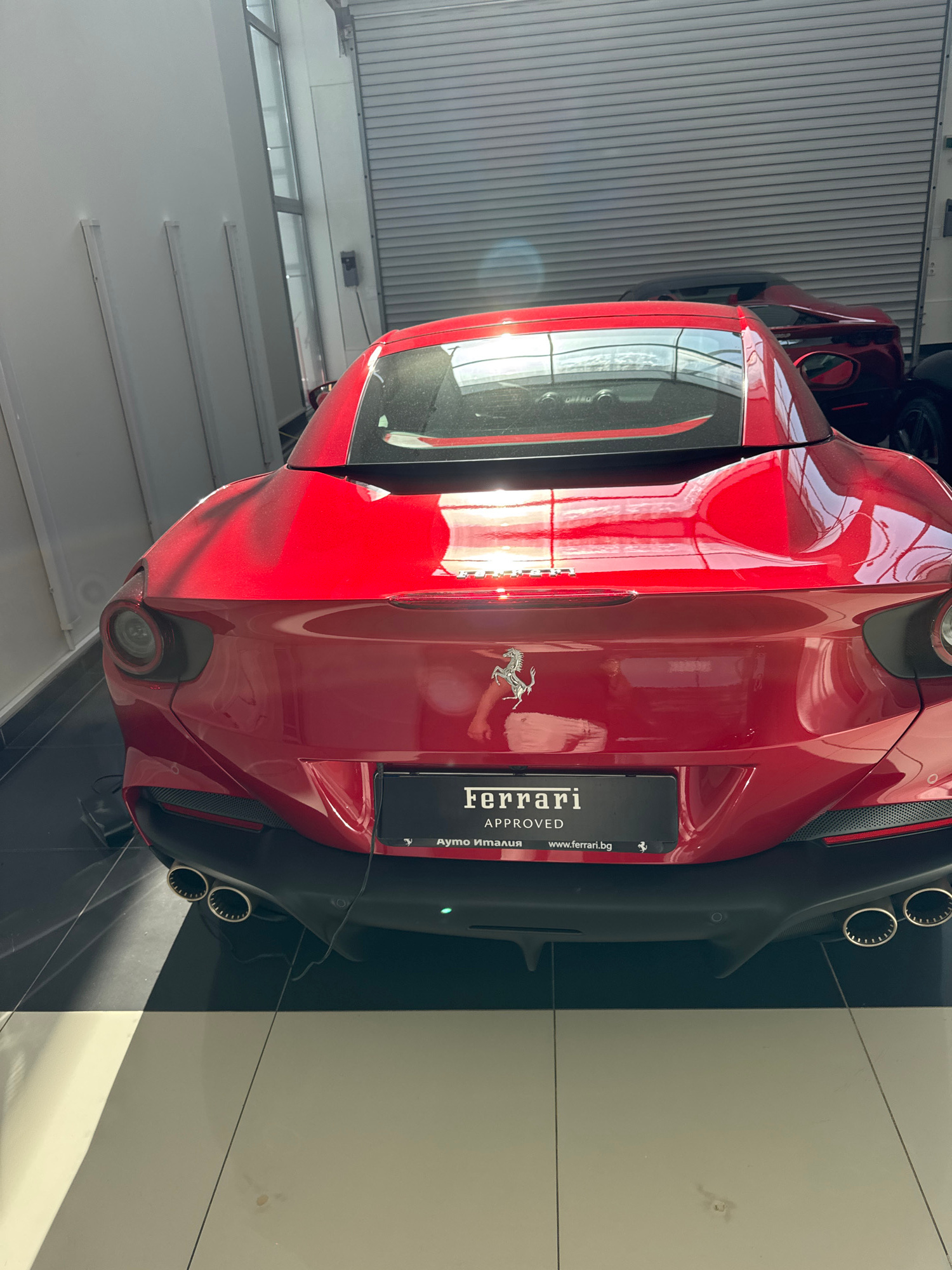 The image displays the rear left quarter of a vibrant red Ferrari sports car, presented indoors within what appears to be a showroom or garage in Sofia, Bulgaria. The original image is rotated 90 degr…read more