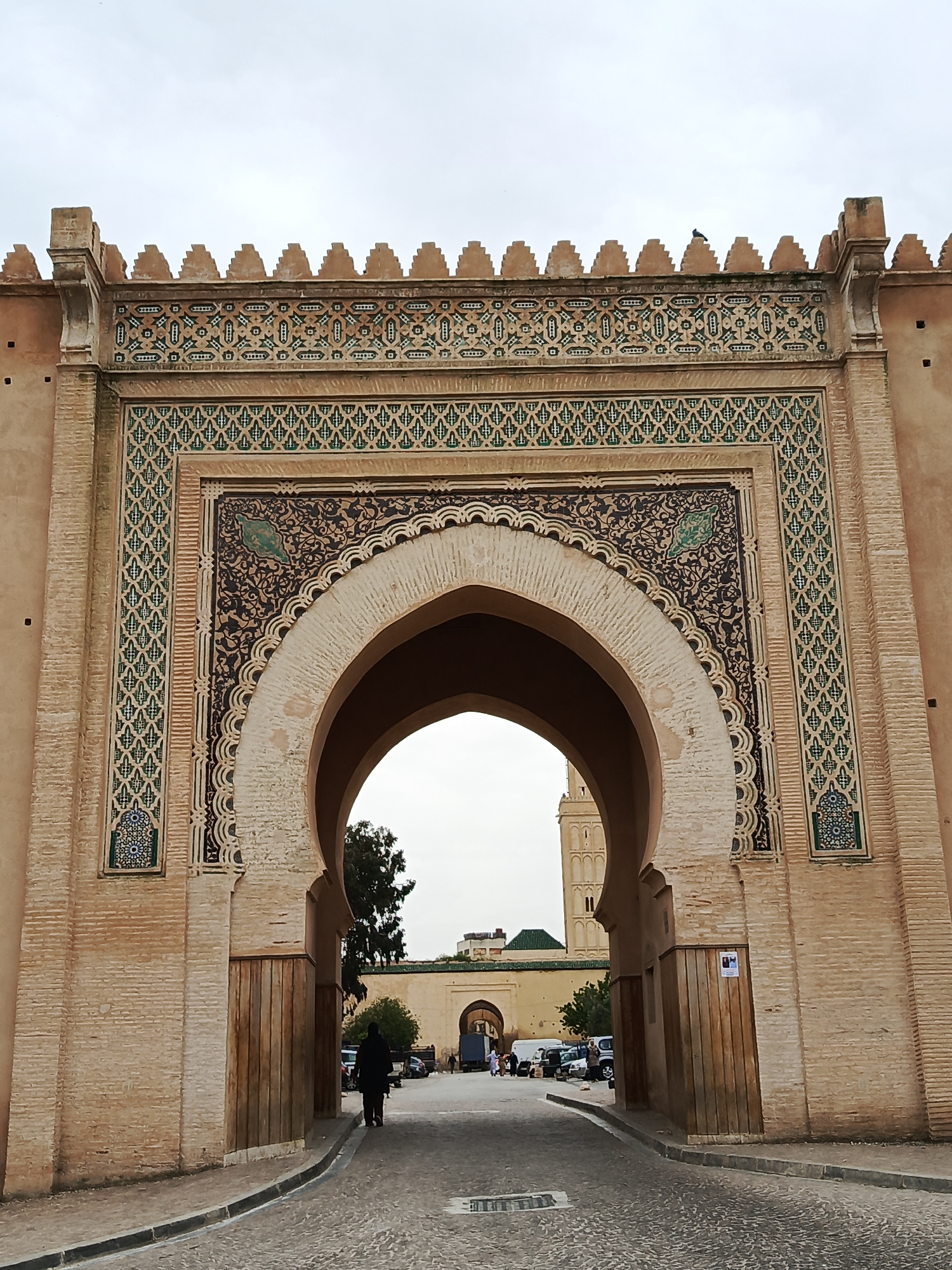 The image shows Bab Mansour, a monumental gate located in Meknes, Morocco. The gate is made of brick and decorated with intricate mosaic tilework in geometric and floral patterns. An arched opening isβ¦read more
