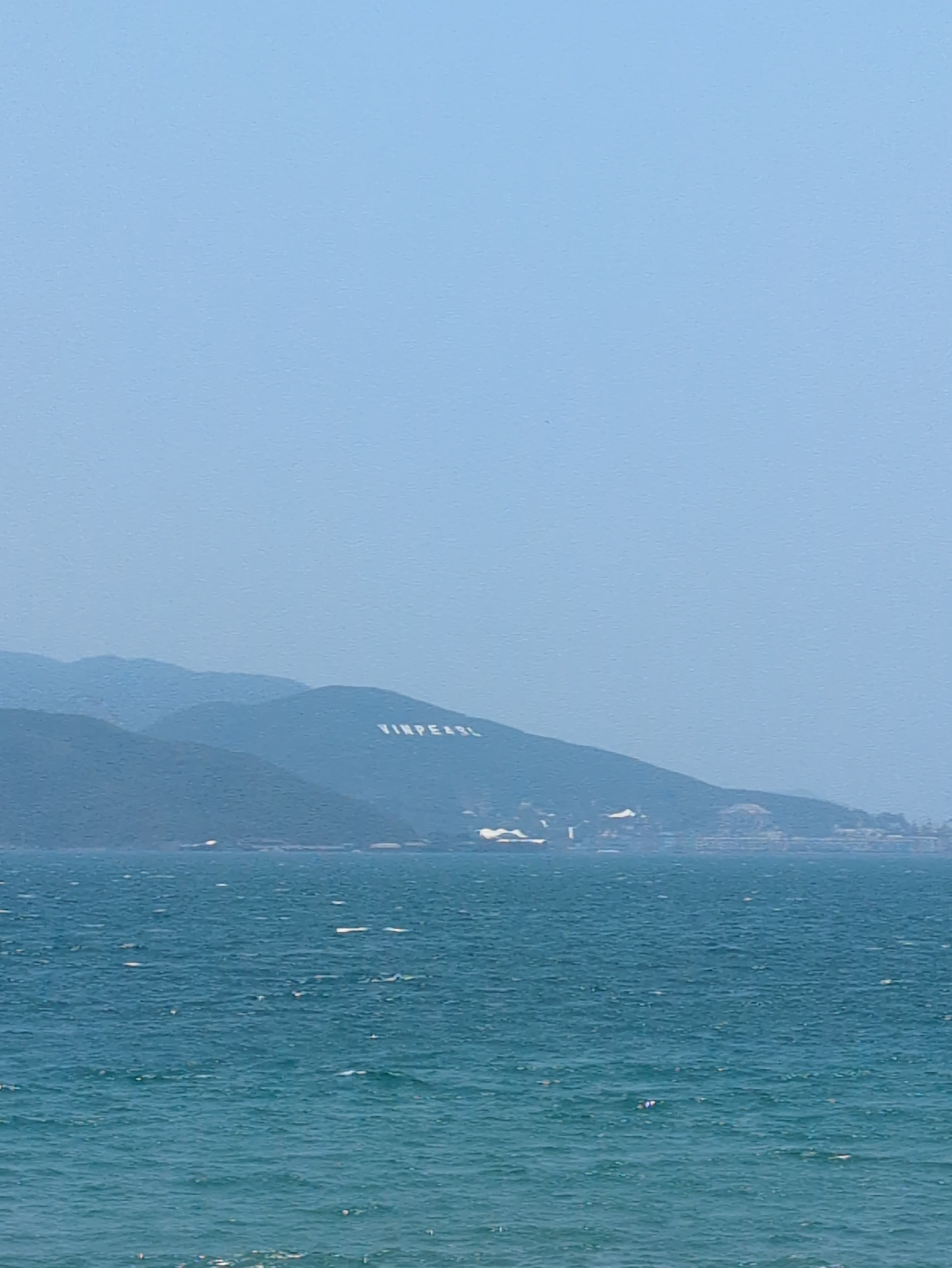 The image shows a scenic view in Nha Trang, Vietnam. The scene consists of a calm, blue ocean on the right side of the image, occupying roughly half of the frame. Adjacent to the ocean, a mountain ran…read more