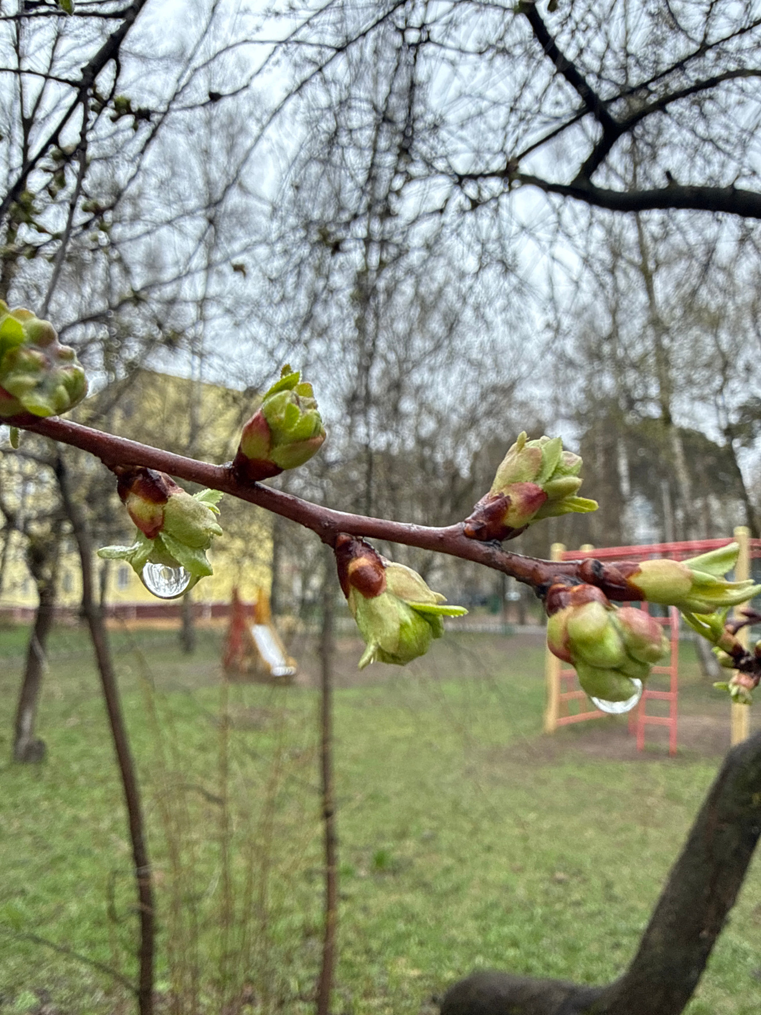 The image shows a close-up of a branch with buds emerging, some with droplets of water clinging to them. The background is a blurry mix of trees, sky, and grass, suggesting a park or green space. A re…read more