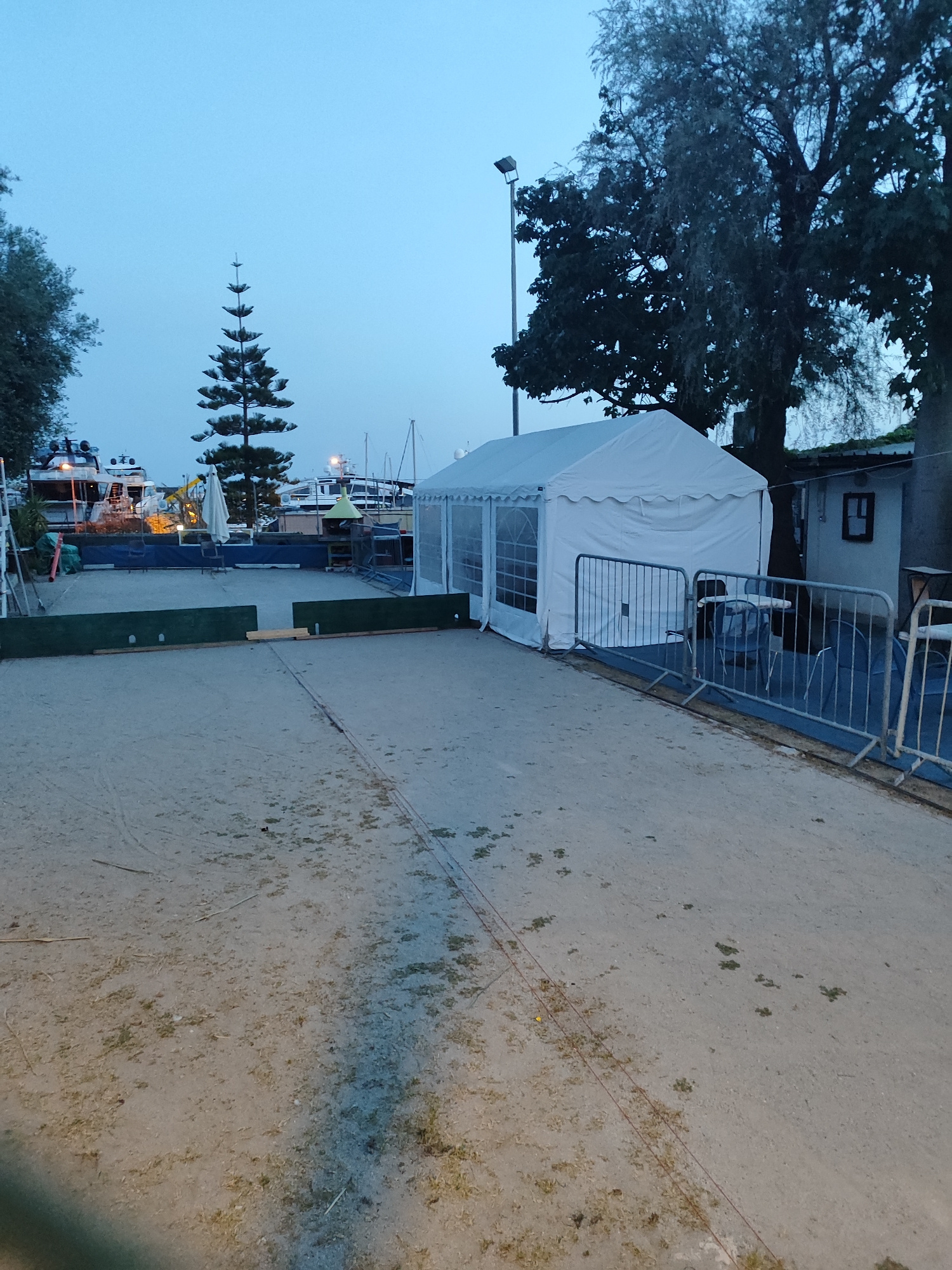 The image depicts an outdoor scene in Sanremo, Italy, near a harbor at dusk. The foreground features a sandy petanque court with sparse vegetation. A white tent is set up to the side, partially enclos…read more