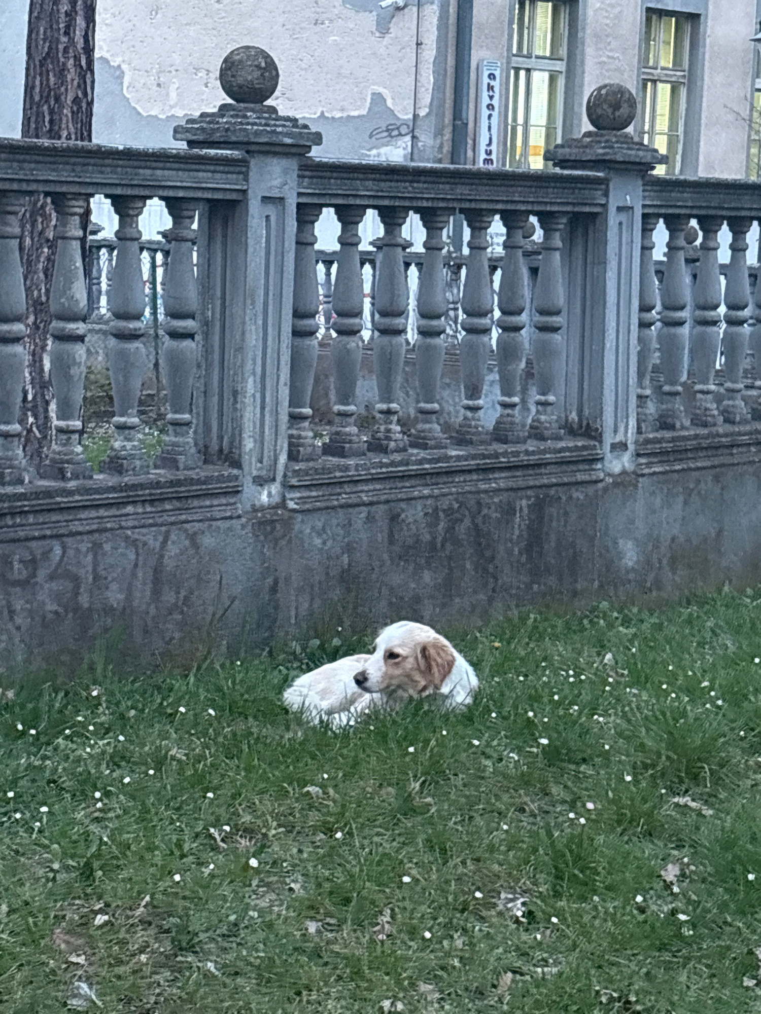 The scene is located at the Kragujevac Aquarium, part of the Faculty of Science, University of Kragujevac, Serbia. A medium-sized dog, primarily white with tan markings on its ears and muzzle, is lyin…read more