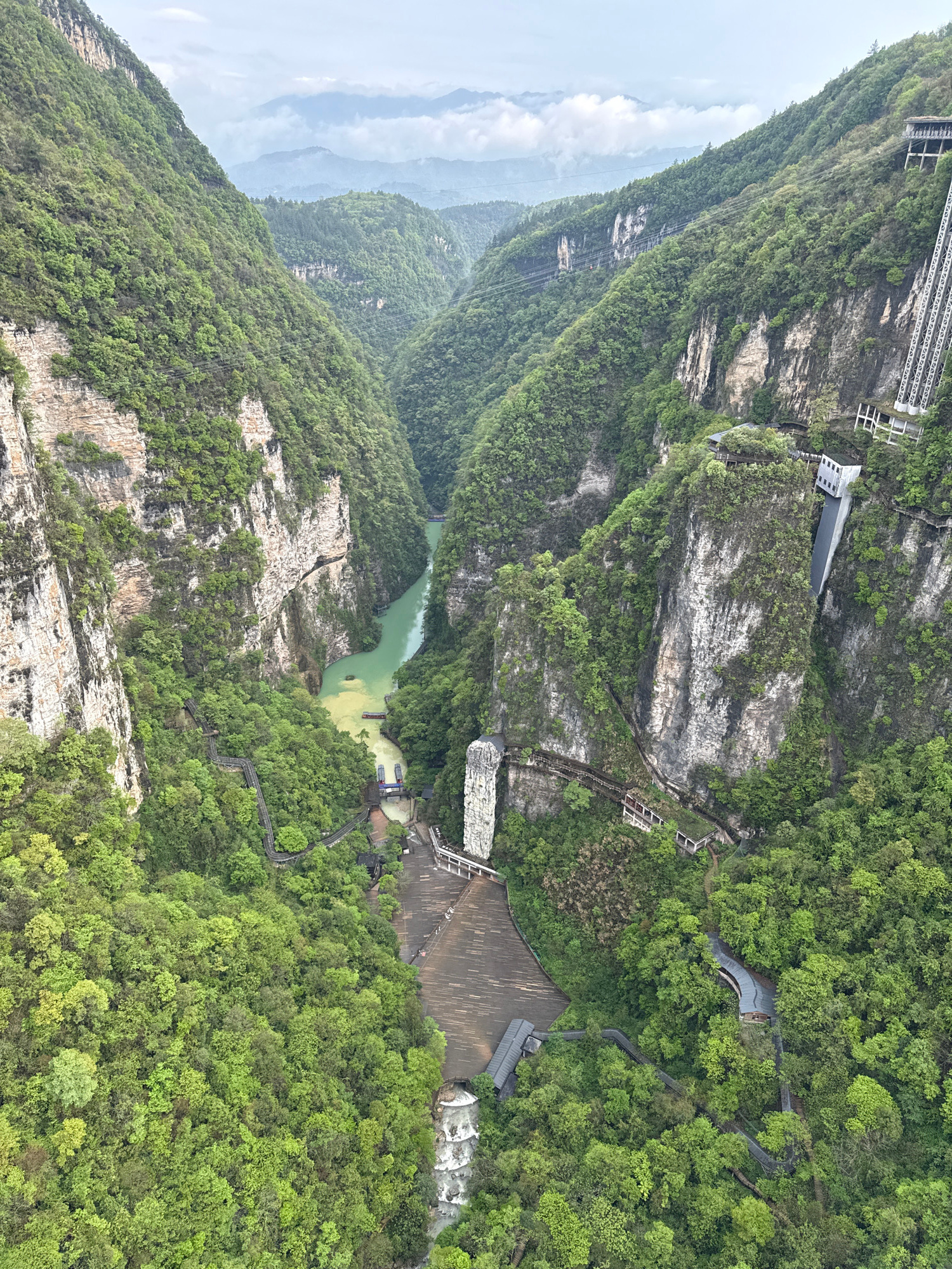 A high-angle shot shows a mountainous, heavily forested landscape in Zhangjiajie, China, featuring gray rock formations, green foliage, and a river winding through the valley. A large dam structure is…read more