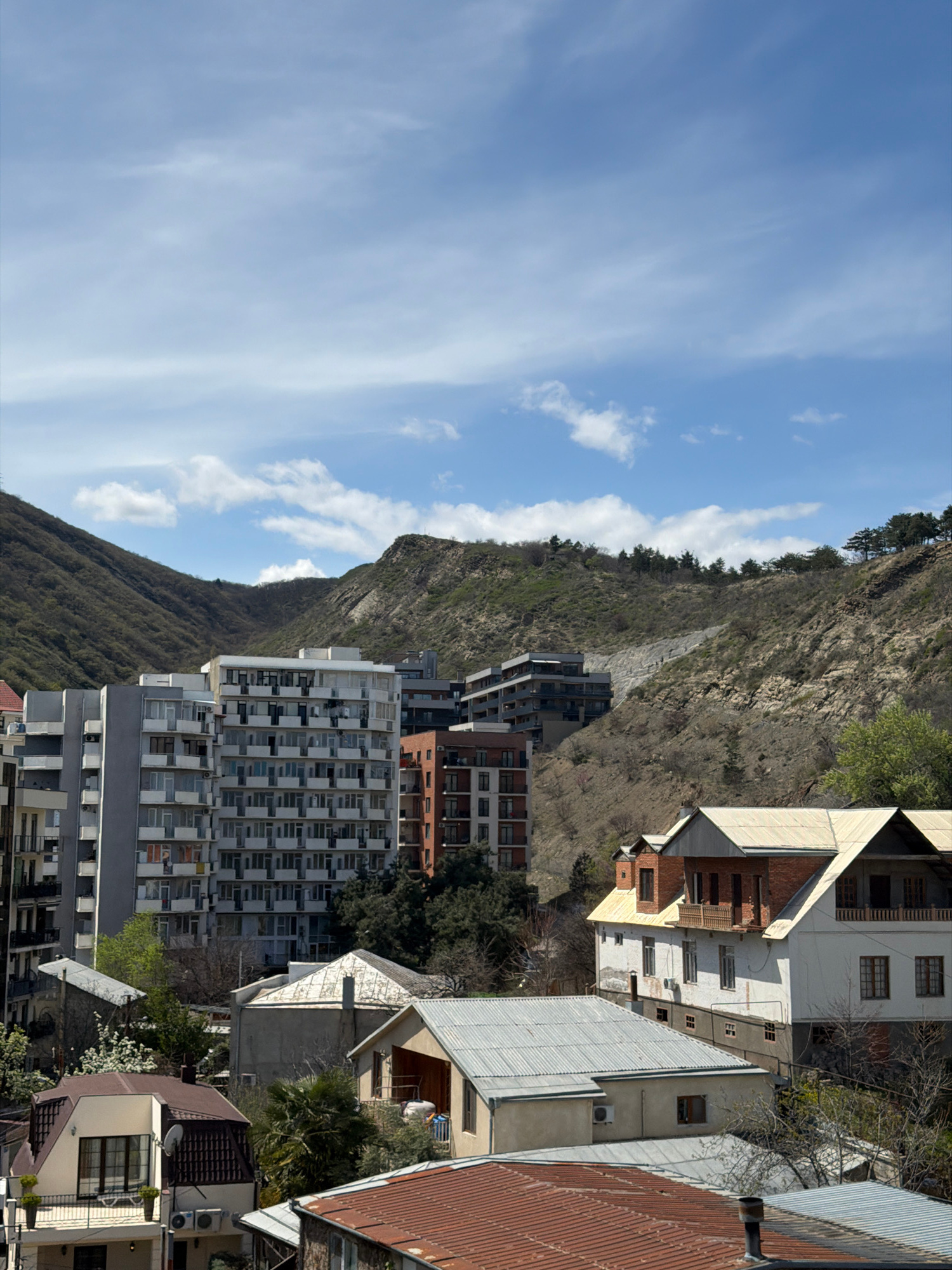 A low-angle shot showcases a cityscape in Tbilisi, Georgia, featuring a variety of buildings and the presence of a mountain landscape. In the background, a mountain is visible, partially covered in ve…read more