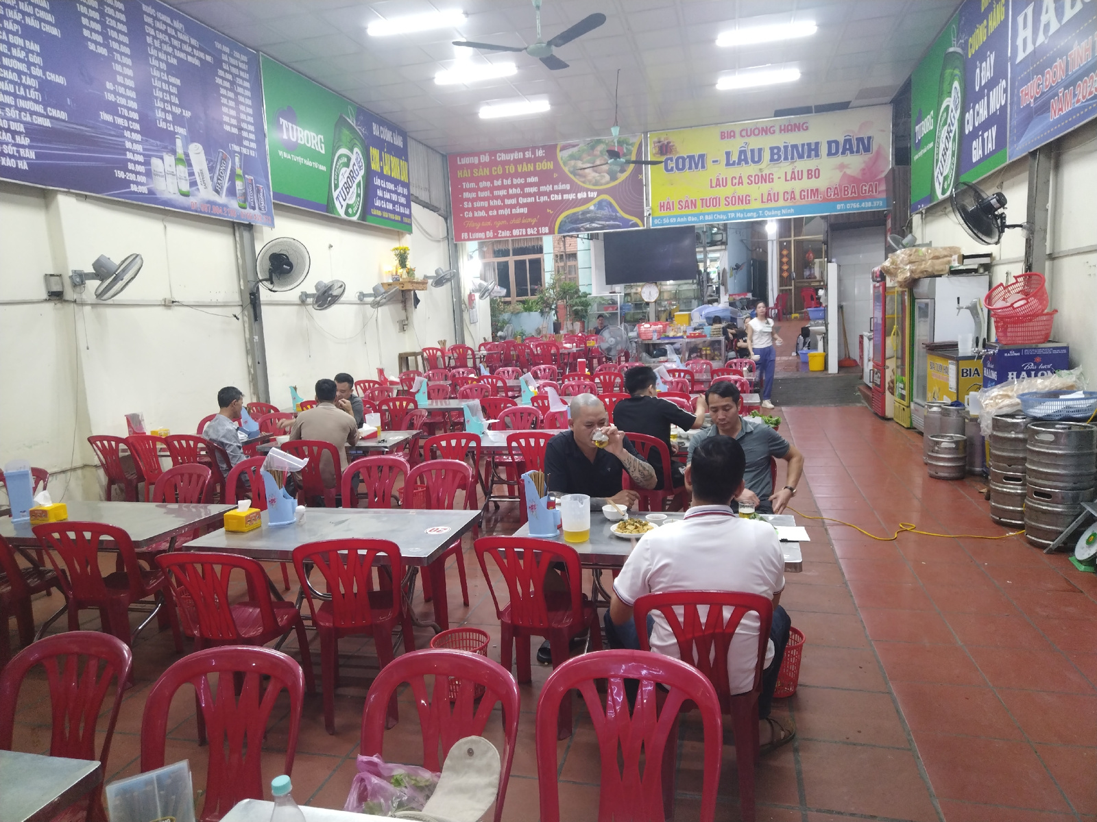 The image displays the interior of a casual Vietnamese restaurant or eatery, likely in Bai Chay Ward, Ha Long City, Quang Ninh Province, as confirmed by visible text. The setting is brightly illuminat…read more