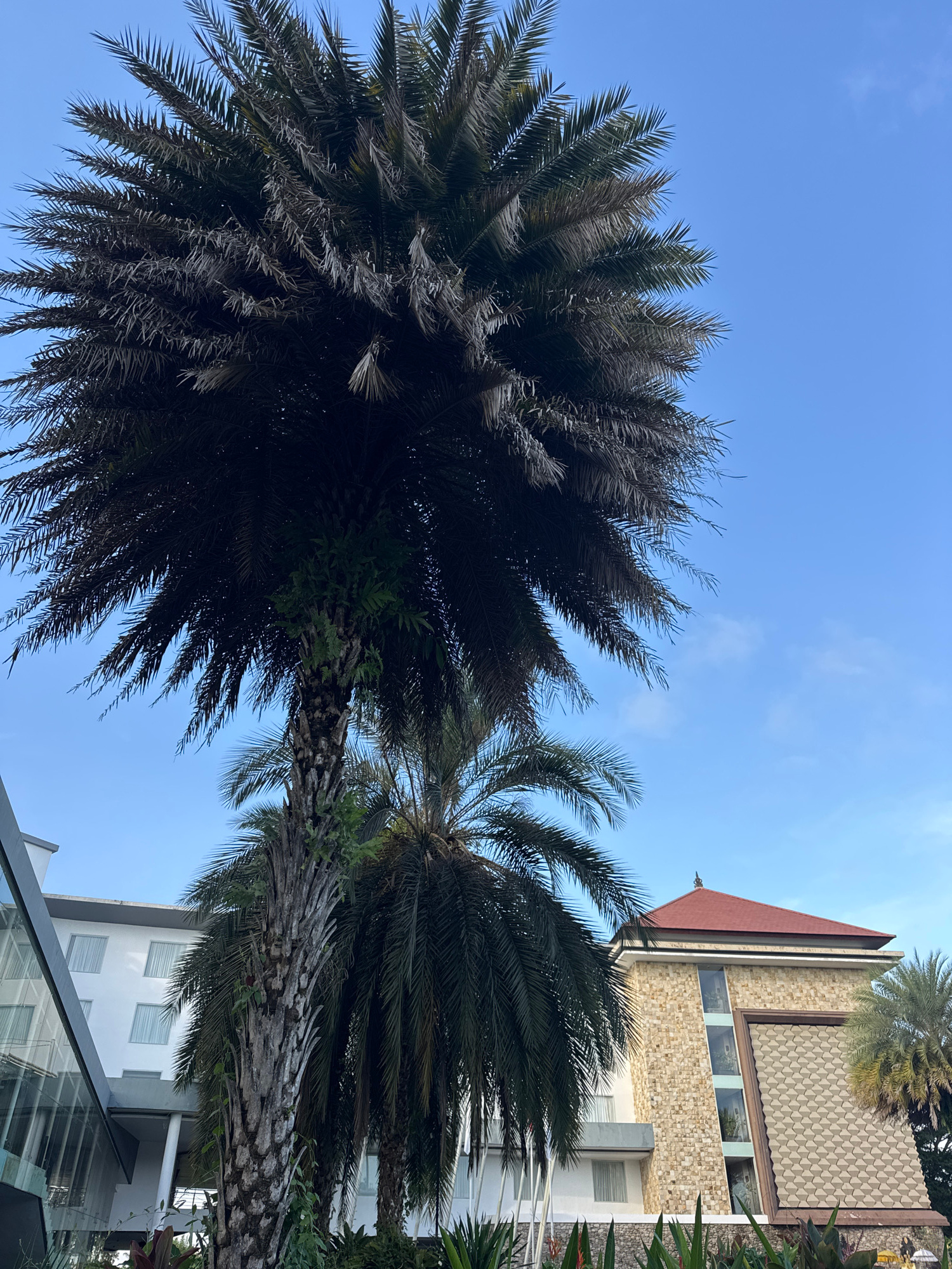 The image shows a low-angle view of palm trees against a clear blue sky, with buildings partially visible in the background. The location is Pecatu, Indonesia. Two prominent palm trees dominate the fo…read more