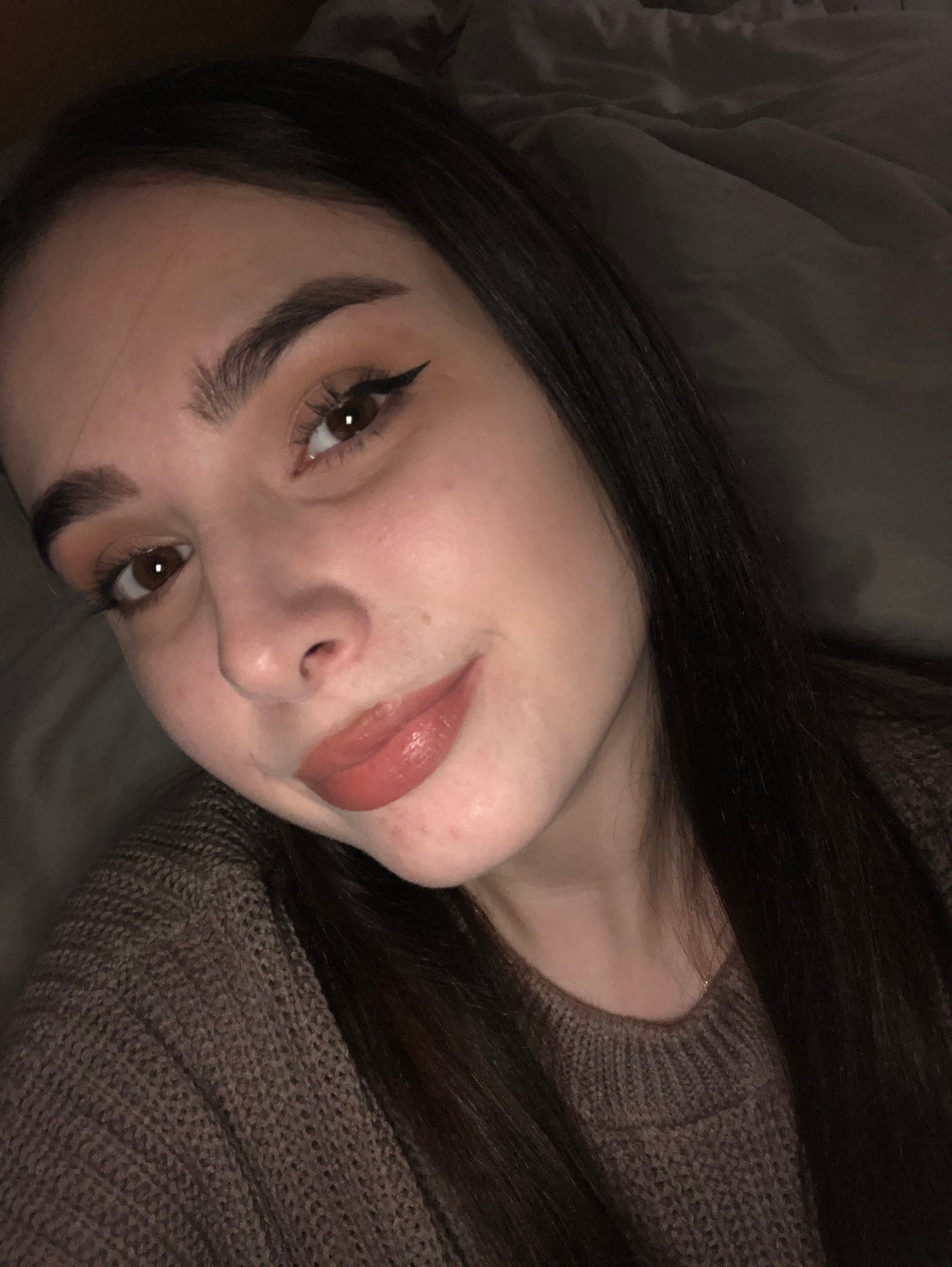 A woman with dark hair and brown eyes lies on a gray bed or soft surface. She is wearing a brown knitted sweater. Her makeup includes eyeliner and lip gloss. The lighting is dim. The location in the c…read more
