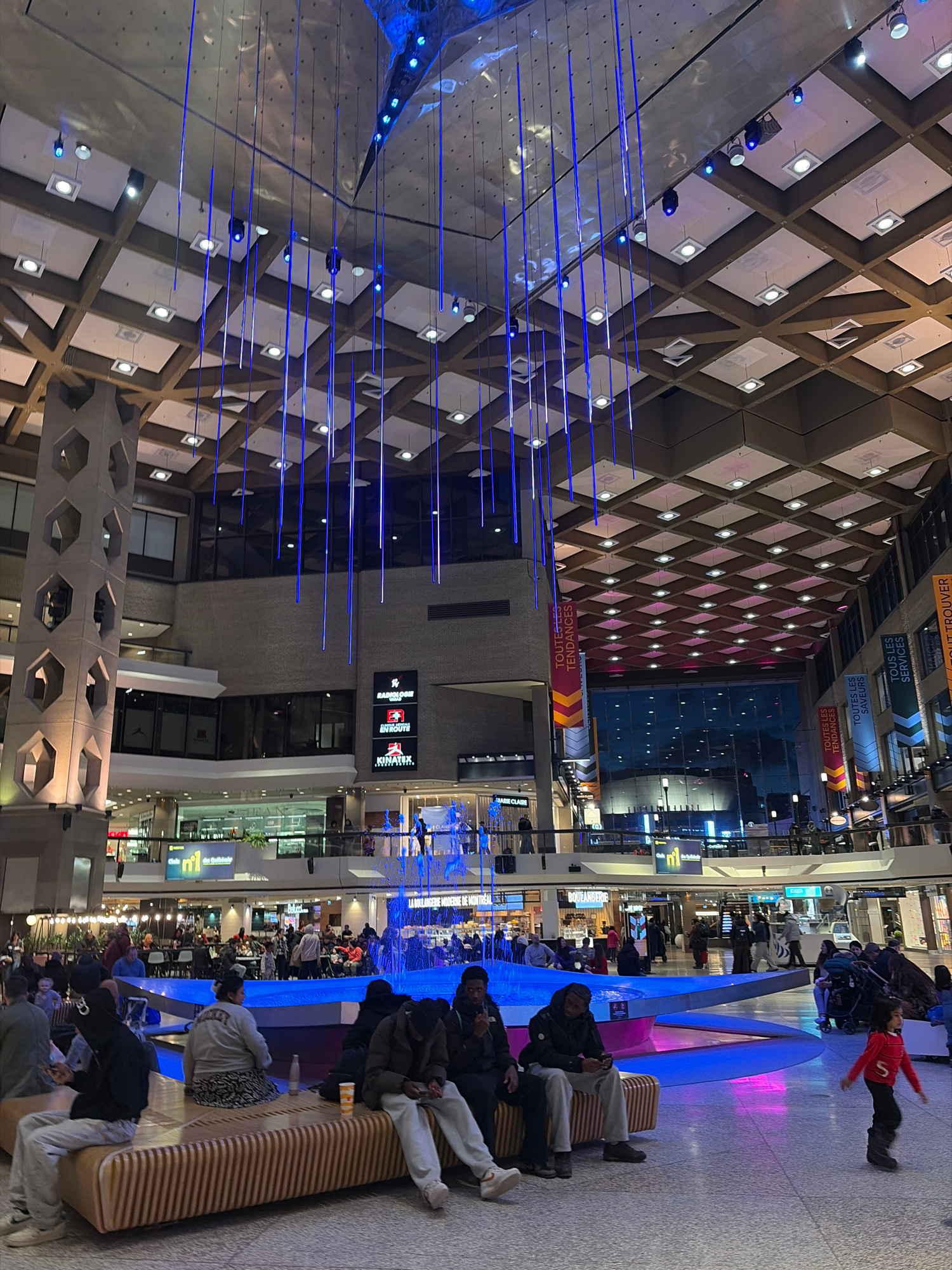 The image captures the interior of a large, multi-level shopping mall, likely the Eaton Centre in Montreal, Canada. The architectural design features a striking geometric grid pattern on the ceiling,…read more